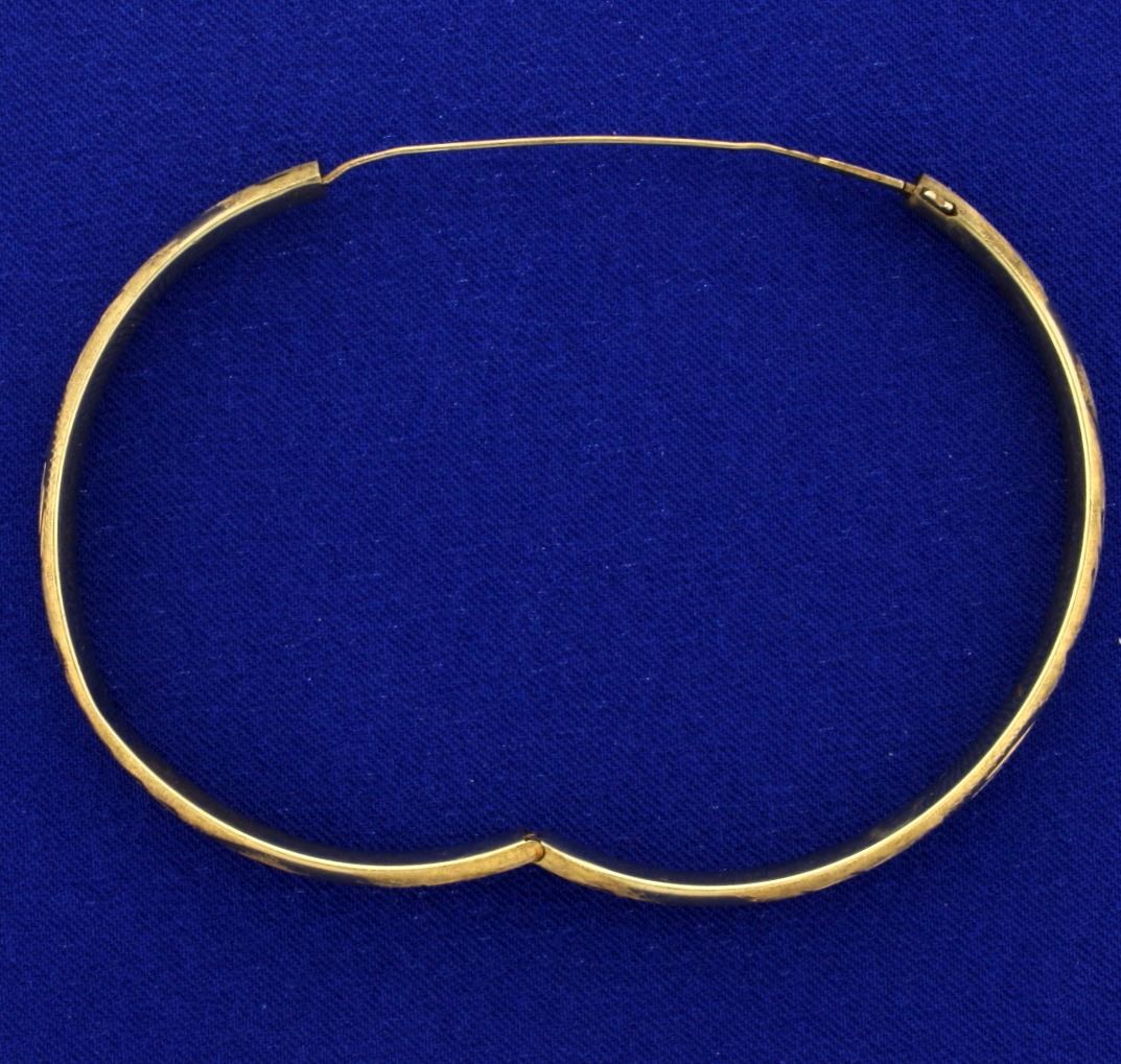 In 14k yellow gold. 2 1/4 Inch diameter. 6.5mm thick. Hinge open. 9.3g.