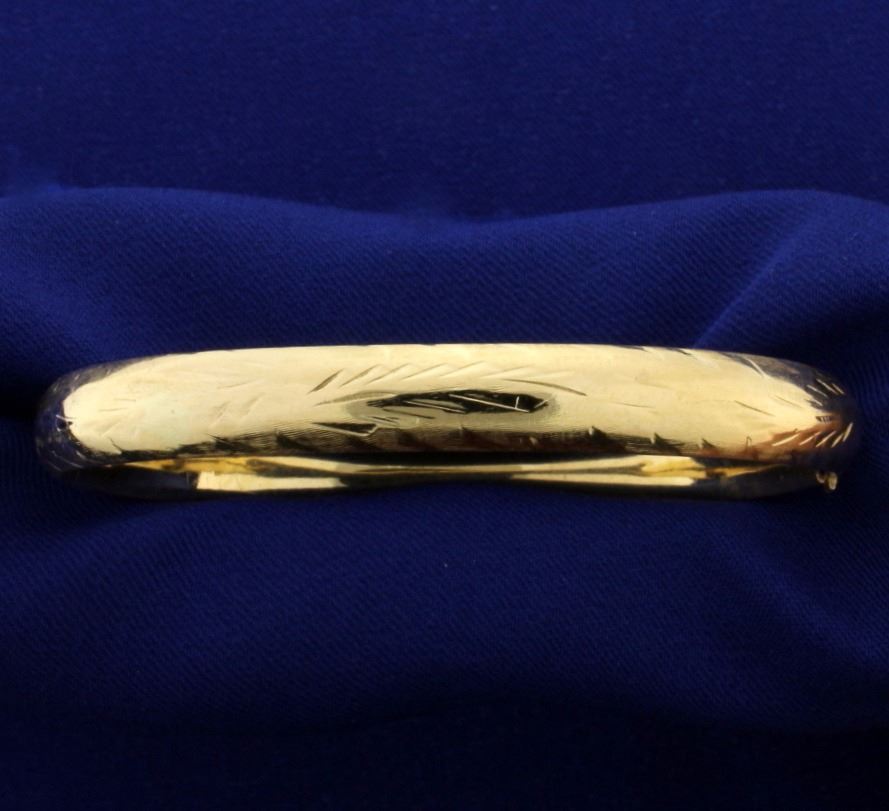 In 14k yellow gold, containing engraving all around bangle. 2 3/8" inside diameter- hinges open for easy putting on and off. 10.9g.