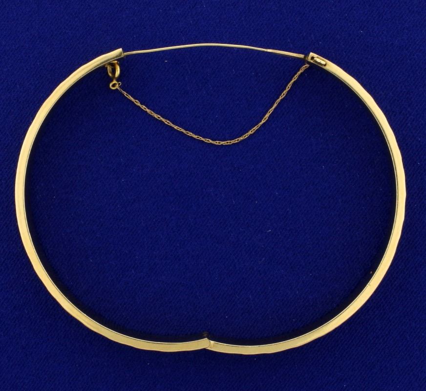 In 14k yellow gold. Bangle has beautiful engraving and a safety chain. Inside diameter of 2 3/8" and hinges open for easy putting on and off. 11.8g.