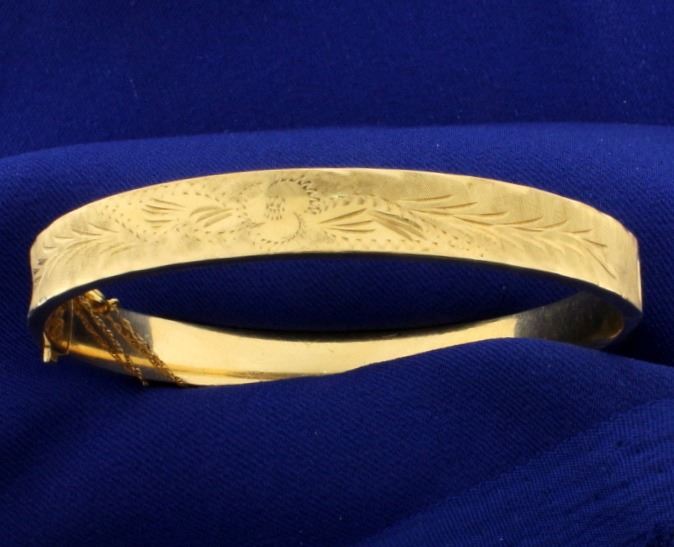 In 14k yellow gold. Bangle has beautiful engraving and a safety chain. Inside diameter of 2 3/8" and hinges open for easy putting on and off. 11.8g.