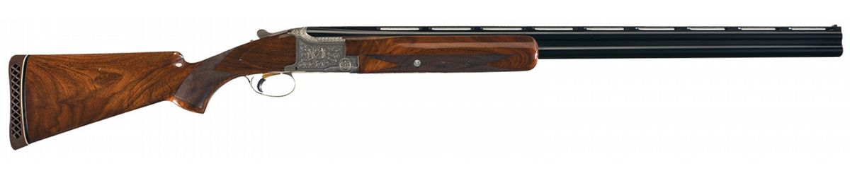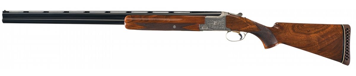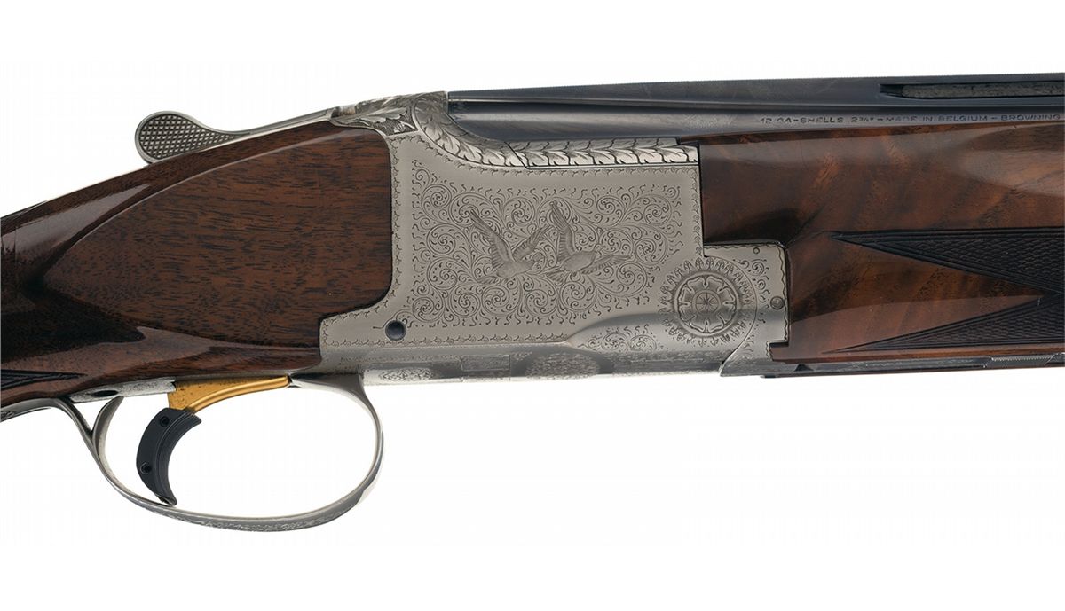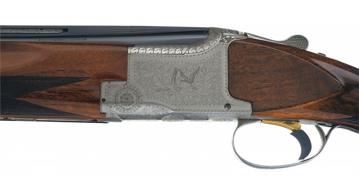 Manufactured in Belgium in 1968. Double ivory bead sights on the wide matte vent rib, 2 3/4 inch chambers, choked full/improved modified with ejectors. The receiver, trigger guard and break lever are engraved with fine scroll patterns as well as rose bouquets on the sides and bottom of the receiver and two pigeons in flight on each side. There is a leaf design decorating the upper edge of the receiver. Blue barrels with standard markings, and the remaining parts are coin finished. Gold washed single trigger with a shoe installed, tang mounted safety/selector and mounted with high gloss, walnut, extra fancy walnut forearm and pistol grip stock with a vented Browning recoil pad. Length of pull is 14 3/8 inches.