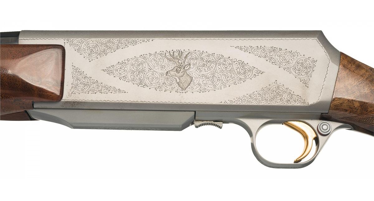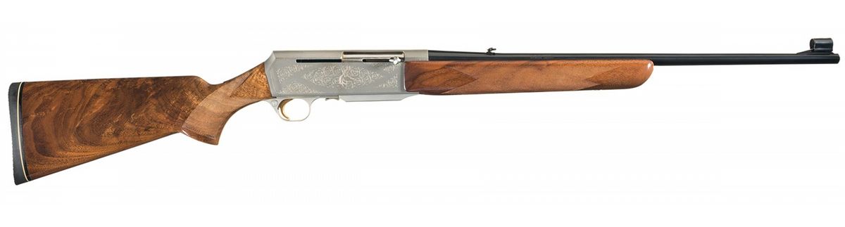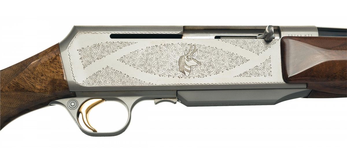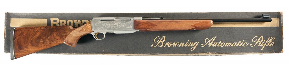 Manufactured in Belgium. Hooded front sight, adjustable folding leaf rear sight and the receiver is drilled and tapped for optics. Gold washed trigger, hinged box magazine. The grey finished receiver is floral pattern engraved and has a prong horned antelope on the right side and buck on the left side. Mounted on a fancy checkered walnut forearm and pistol grip stock with a Browning solid rubber recoil pad. Complete with a factory box, numbered to the gun.