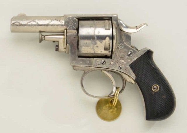 Engraved Belgian DA revolver marked “BRITISH BULL-DOG” on top strap, .38 cal., 2-1/2” barrel, nickel finish, checkered hard rubber grips, #19844. This gun is in overall very good condition showing considerable originalfinish, good bore, tasteful scroll and punch dot engraving; bee stamped design on left side of frame with D and L marked on the wings of the bee; action needs adjustment, very good grips. Est.: $300-$600.