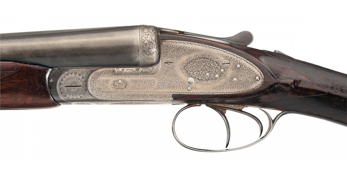 Beaded front and notch rear sights, 2 3/4 inch chambers, choke gauges full/full and ejectors. The right barrel has an illegible marking with "AMES LIEGE" on the left barrel. Barrel flat has the number "P.1K368.2" and has proofs including a Liege ELG proof. Action features a scroll and rose blossom engraving with deep relief oak leaves on the fences. Gold inlaid "1" on the break lever and inside of the forearm hardware. Double triggers and tang safety. Nicely figured checkered straight grip stock with replacement semi-beavertail forearm, vented Pachmayr recoil pad and two silver initial ovals (one is monogrammed). Length of pull is 14 1/4 inches.