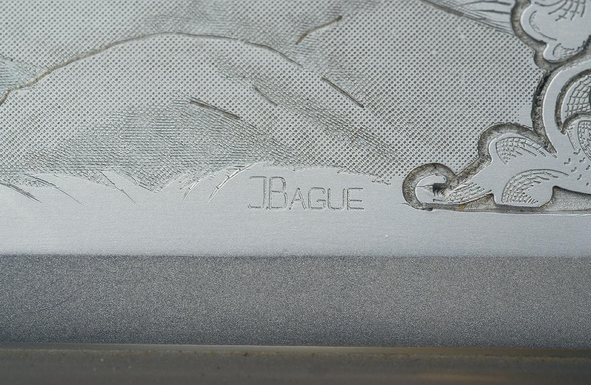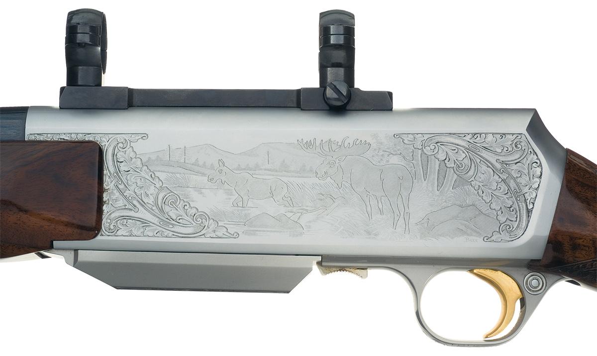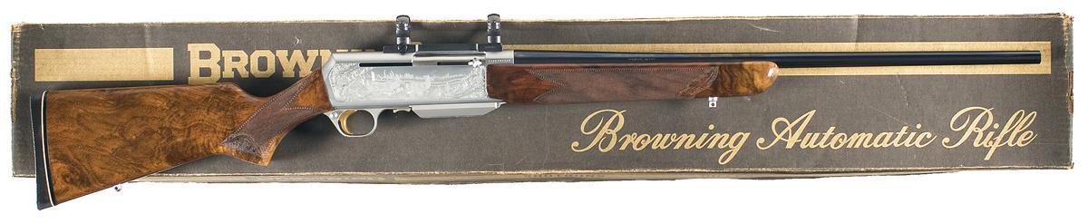 Manufactured by Browning in 1978, this rifle features a standard weight barrel built with no sight and the receiver drilled and tapped with Leupold base and rings attached. The trigger is gold washed with a polished bolt and handle. The barrel is marked with the caliber on the right side and the Browning one line address over "MADE IN BELGIUM" on the left side. The Browning Crown proof is marked on the left side of the barrel at the receiver. The left side of the receiver is engraved with scroll work surrounding a detailed game scene with two moose depicted in a lake scene. The left side shows the same detailed scroll work with a game scene of Elk running along with scroll engraving on the floor plate and trigger guard. The receiver is signed on the left side with the engravers signature, "J. BAGUE". The rifle features a highly figured walnut stock with fine line checkering and oak leaf carved borders. Complete with sling swivel studs, black Pachmyr pad and the original Browning box.