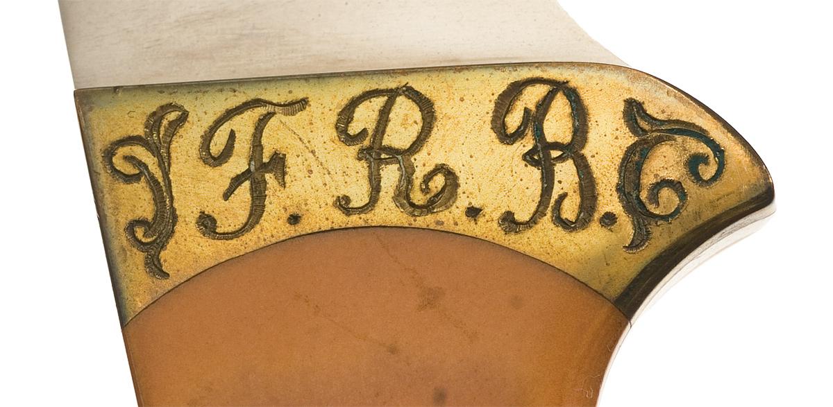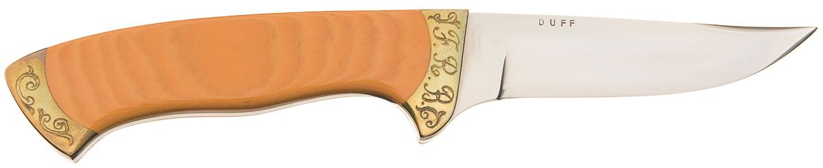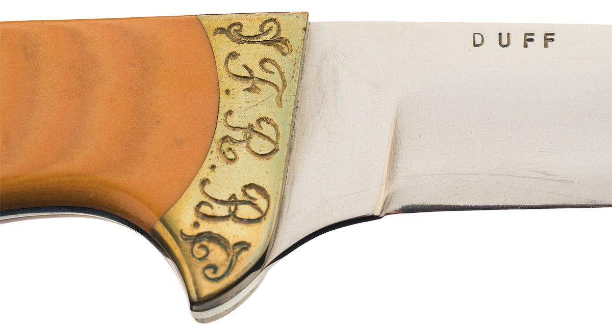 This knife was handcrafted by Knifemakers' Guild member Bill Duff of Reno, Nevada. From 1965 to 1970 Duff worked for Buck Knives and then started Rigid Knives with Don Collum out of his garage before making it on his own in 1976. This Duff knife features a 3 7/8 inch blade marked "DUFF". The brass finger guard and rear bolster have a light scroll engraving, with the initials "F.R.B." in large script font on the right side of the guard. Fitted with micarta scales. OAL: 8 3/4".