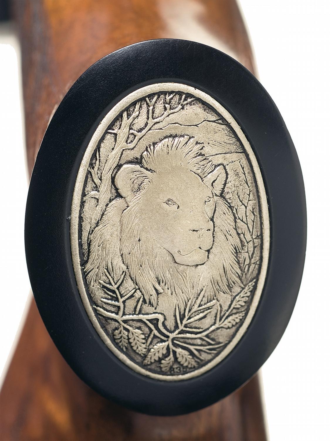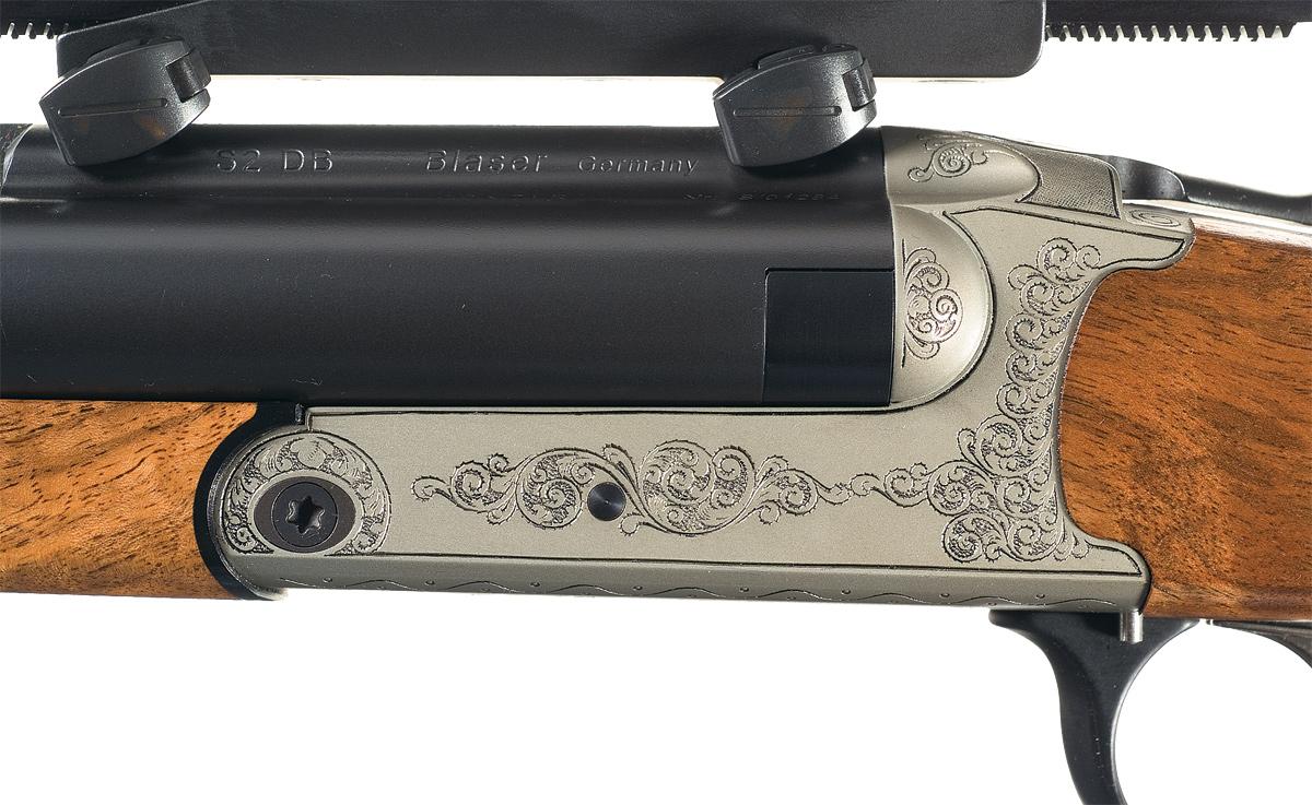 This high grade double rifle was manufactured in Germany and features a side by side double barrel configuration with a solid rib. The barrels are equipped with a raised ramp front sight with a high visibility red bead and fixed rear sight on a raised ramp. There is a Swarovski 1.25-4x24 scope mounted on the rear quarter rib. The scope is equipped with an illuminated reticle, and has a scope box. Both barrels are chambered for 9.3 x 74R and the upper left rear barrel is marked "S2 DB BLASER GERMANY" over the caliber designation and serial number. The frame has a matte coin finish with light floral scroll engraving and "Blaser" on the bottom. The rifle is equipped with a cocking lever and automatic tang mounted safety and mounted with extra fancy skip line checkered walnut forearm with an ebony forend and pistol grip stock with left hand palm swell, grip cap engraved with a lion, black leather Blaser recoil pad and sling swivel stud. Manual is included.