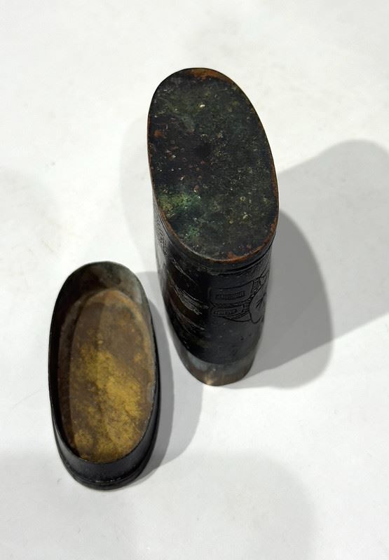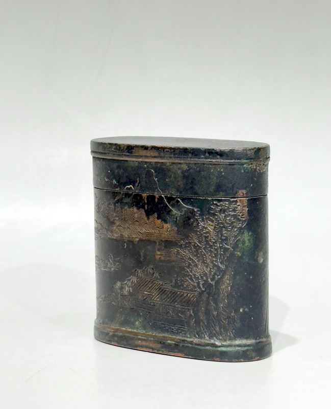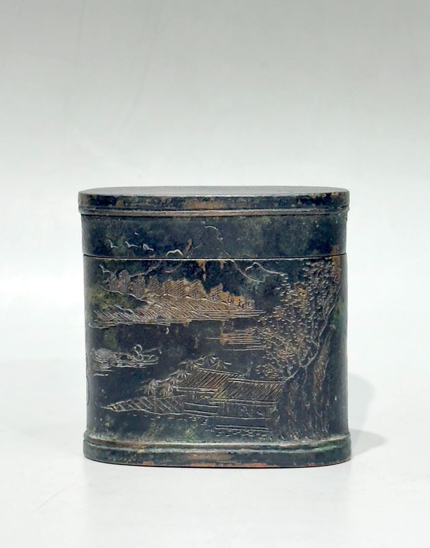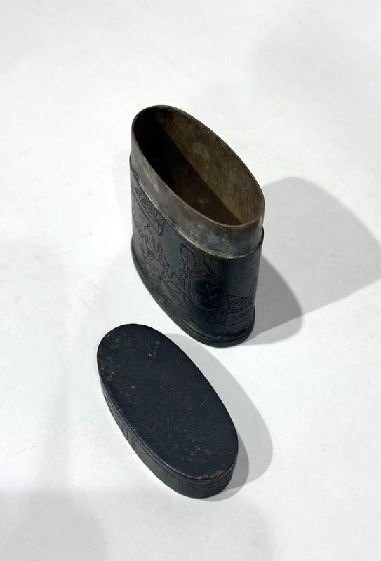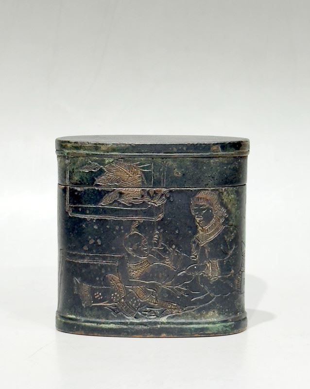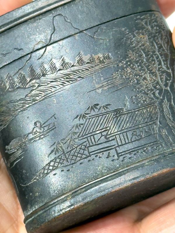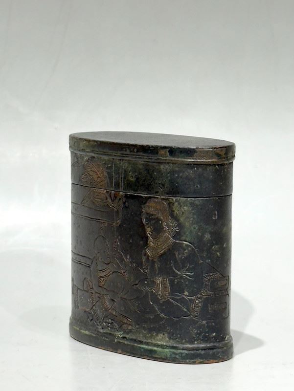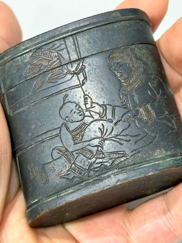 A small and finely made bronze opium paste box with tightly fitting lid. The surface is decorated with incised designs depicting figures in a domestic scene, accompanied by birds and plants. The engraving is simple yet expressive, evoking folk life themes. The bronze has developed a natural patina over time, giving it an antique charm. Such boxes, popular from the late Qing to the Republican period, were commonly used to store snuff or opium paste, serving both practical and decorative purposes.