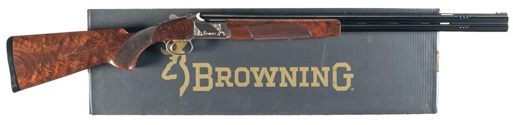 Manufactured in 2002. The sides of the receiver have flourishes of floral scroll engraving. Has a fiber optic front sight, a white mid bead sight, is threaded for Invector Plus choke tubes with improved cylinder/modified installed, is ported and has 2 3/4 inch chambers with ejectors. Trigger is adjustable for length. Mounted on a beautifully figured checkered walnut forearm and pistol grip stock with solid black rubber recoil pad. Length of pull is 14 7/8 inches. With box numbered to gun, 1 extra choke tube, two extra triggers, choke wrench, extra light pipes, an Allen wrench, lock and manual.