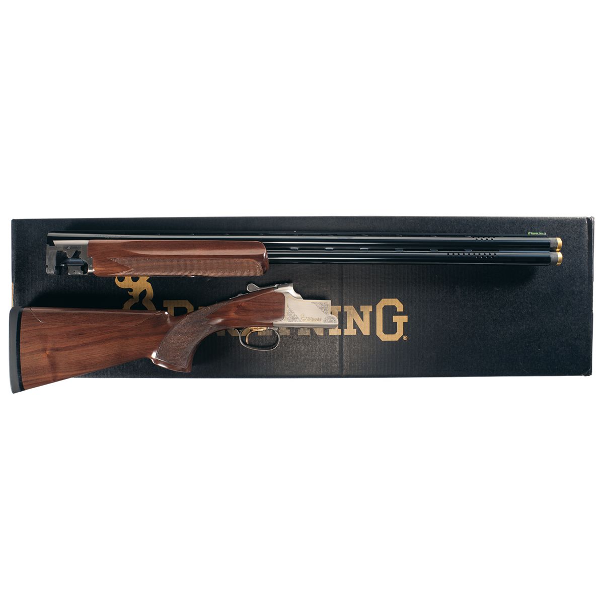 Manufactured in Japan with a green Hi-Viz Comp front and ivory bead mid sights on a matte ported vent rib barrel. 2 3/4 inch chambers with invector plus choke system and extended Skeet/Cylinder Midas choke tubes. Floral scroll engraved receiver with gold outline, single detachable checkered trigger and tang mounted safety/selector. Mounted on a checkered semi-beavertail forearm and pistol grip stock with adjustable comb. Fitted with a solid Browning rubber buttpad. Length of pull is 14 1/4 inches. Complete with original box numbered to gun, choke tool, allin wrench, two extra smooth gold wash triggers, replacement Hi-Viz front sights, chamber lock package, manual and three extra extended Midas choke tubes including: modified, improved cylinder and LMOD.