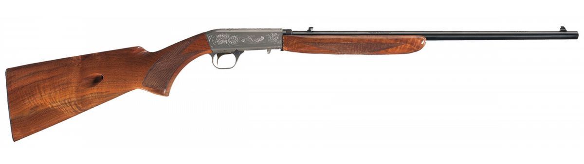 This rifle was manufactured in 1980 with a fixed beaded blade front sight and an elevation adjustable flip up rear sight. The right side of the receiver is engraved with two squirrels on a branch with bouquets of floral scroll, the left side is engraved with two prairie dogs with bouquets of floral scroll, the top is engraved with a duck in flight and bouquets of floral scroll and the trigger guard is engraved with floral scroll. Mounted on a nicely figured multi-point checkered walnut forearm and pistol grip stock with serrated steel buttplate.