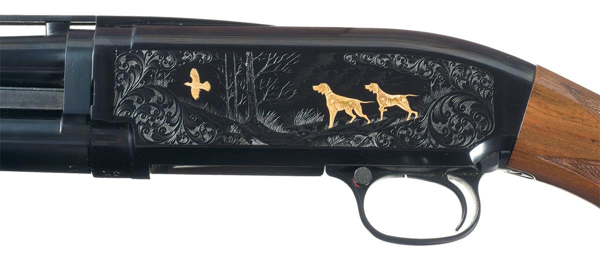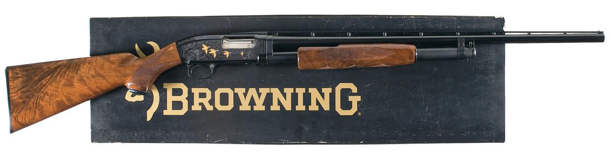 Matching serial number to two other boxed Browning shotguns in this auction. Grade V, introduced in 1991 and manufactured in Japan. Engraved receiver with gold marsh and woodland scene inlays, single bead front sight on a floating high post rib, 2 3/4 inch chamber, choked modified. High gloss walnut stock with deluxe checkered forearm and pistol grip stock, metal grip cap and black plastic Browning buttplate. Length of pull is 14 inches. Complete with factory box numbered to gun and papers.