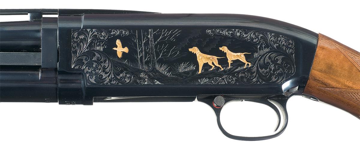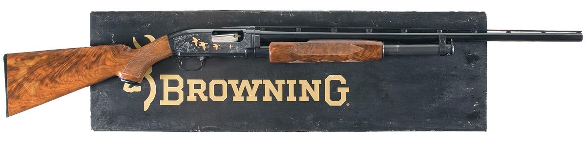 Matching serial number to two other boxed Browning shotguns in this auction. Grade V, introduced in 1991 and manufactured in Japan. Engraved receiver with gold marsh and woodland scene inlays, single bead front sight on a floating high post rib, 2 3/4 inch chamber, choked modified. High gloss walnut stock with deluxe checkered forearm and pistol grip stock, metal grip cap and black plastic Browning buttplate. Length of pull is 14 inches. Complete with factory box numbered to gun and papers.