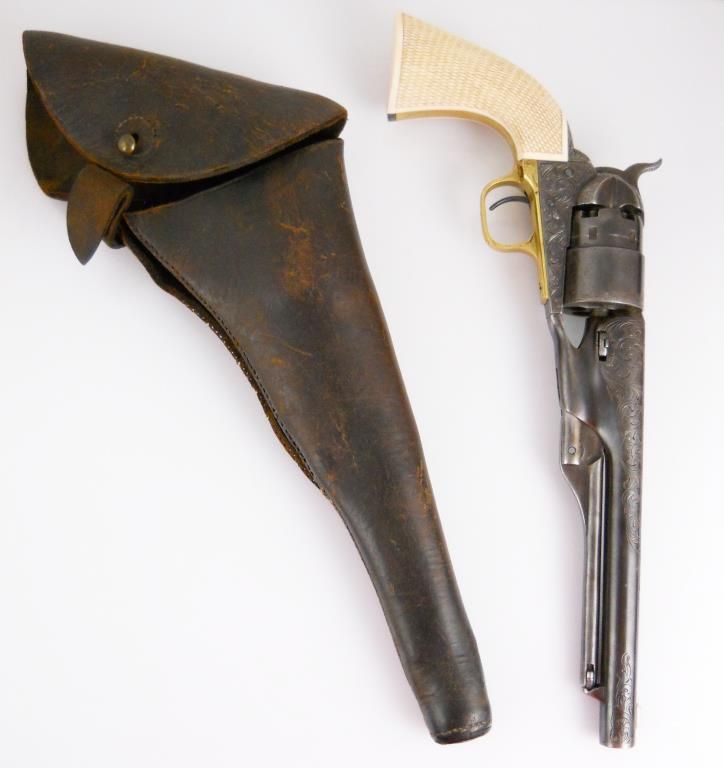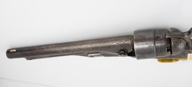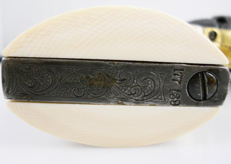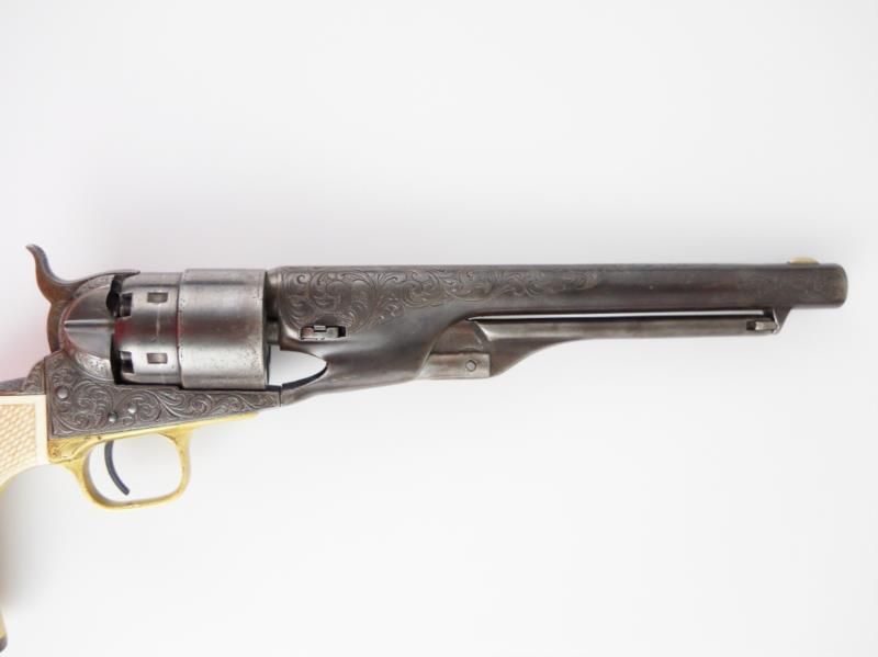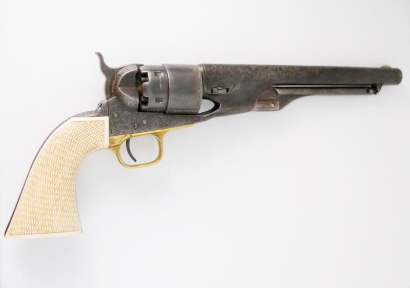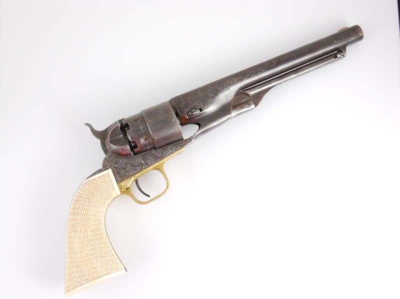 COLT MODEL 1860 REVOLVER CAL.44 Round barrel (8'') marked ADDRESS COL. SAML COLT NEW YORK U.S. AMERICA. Factory Engraved. Ivory Grips grips. No. 177139.