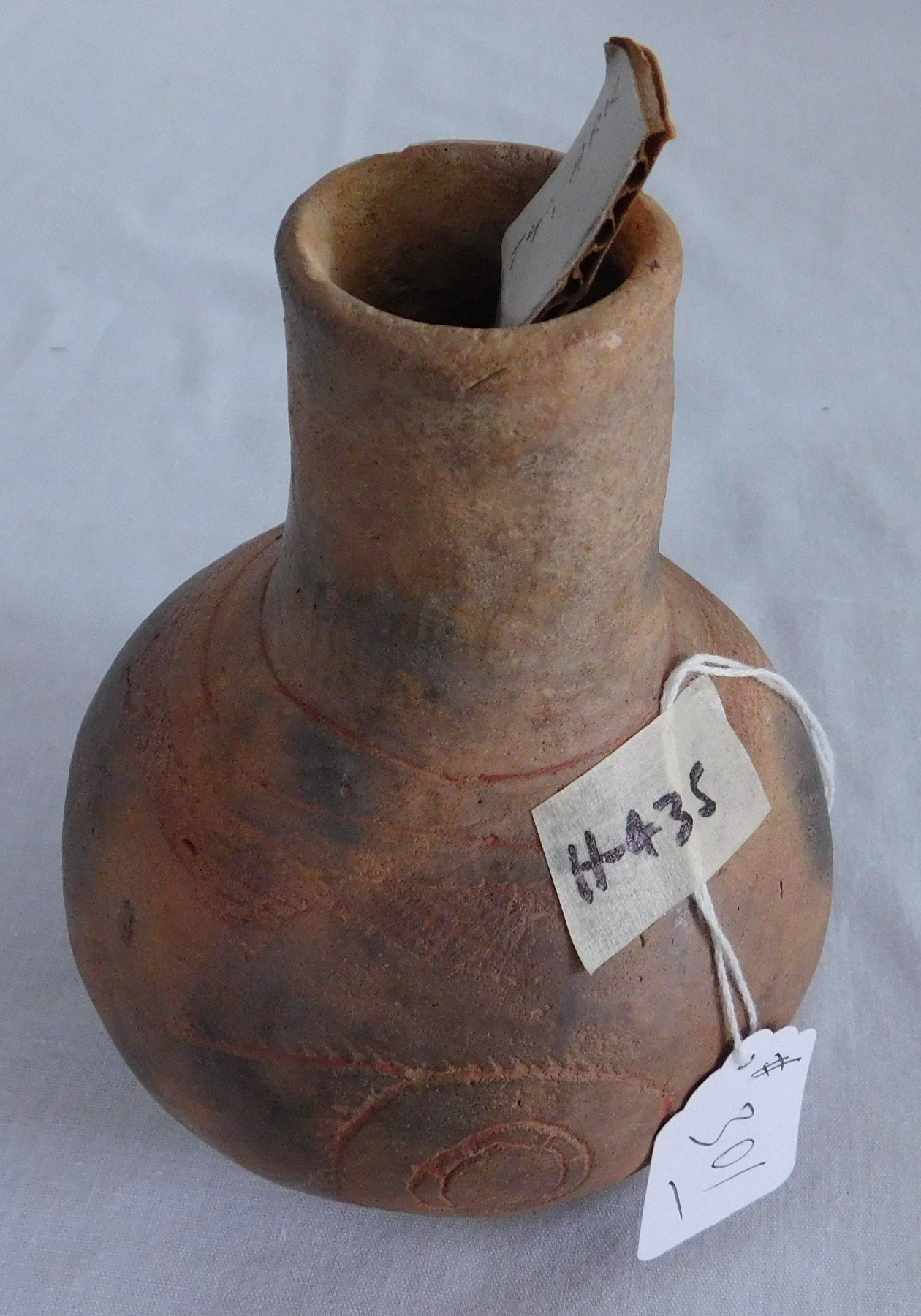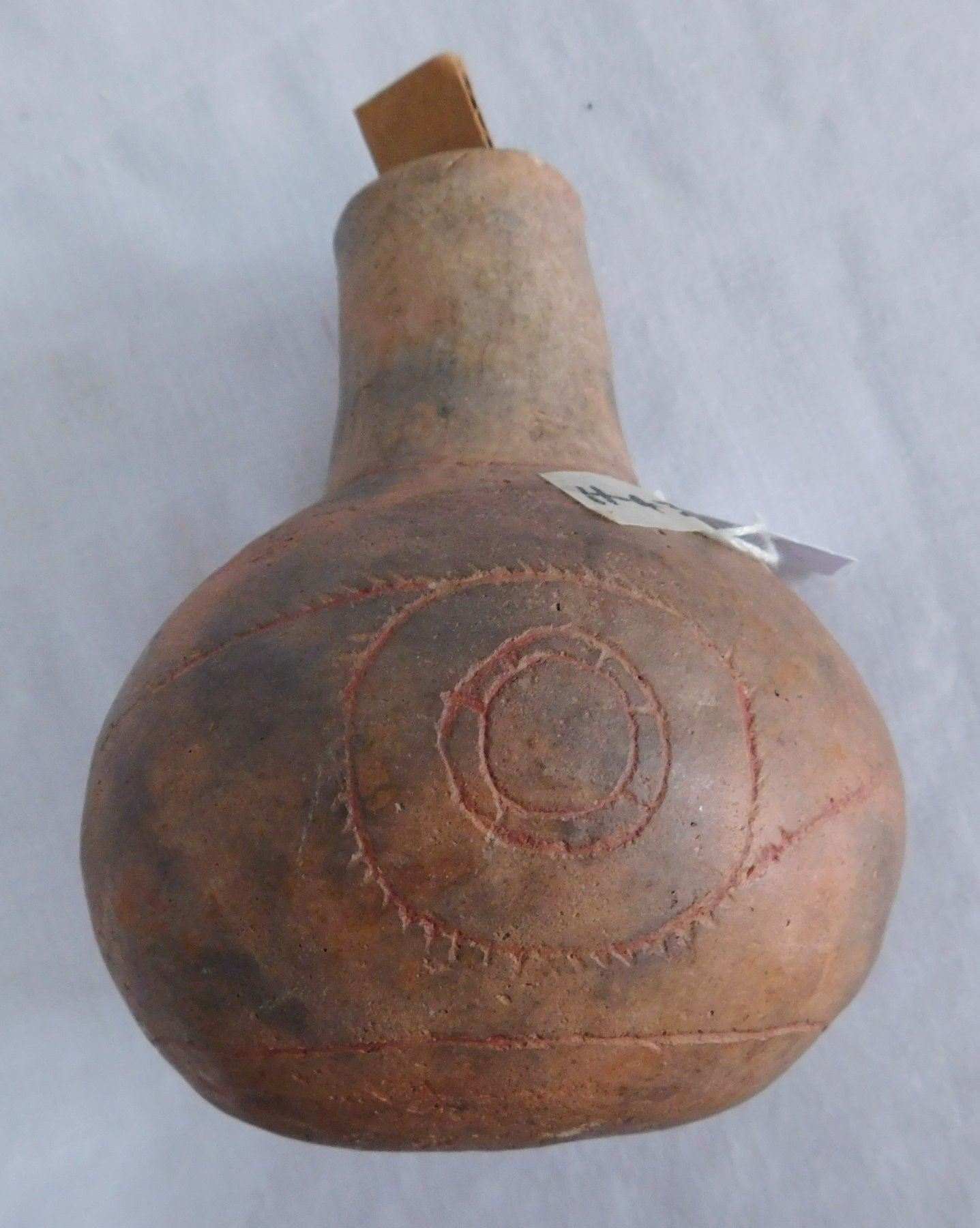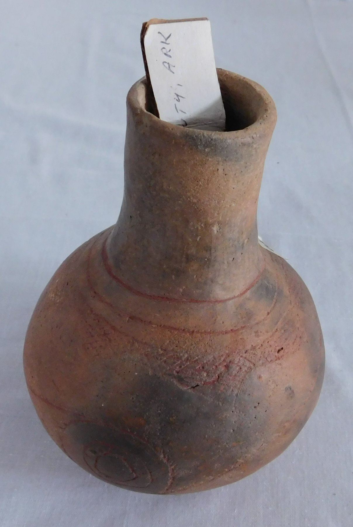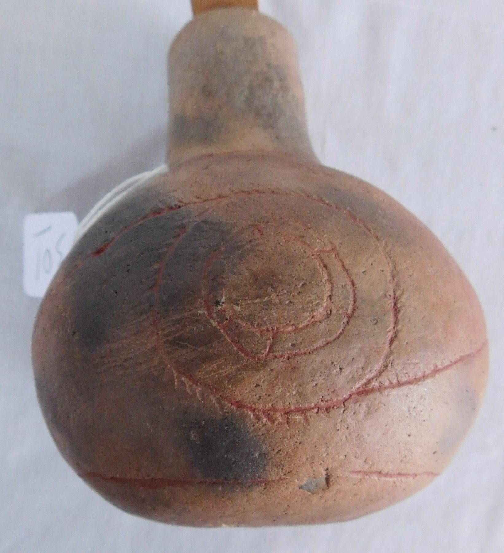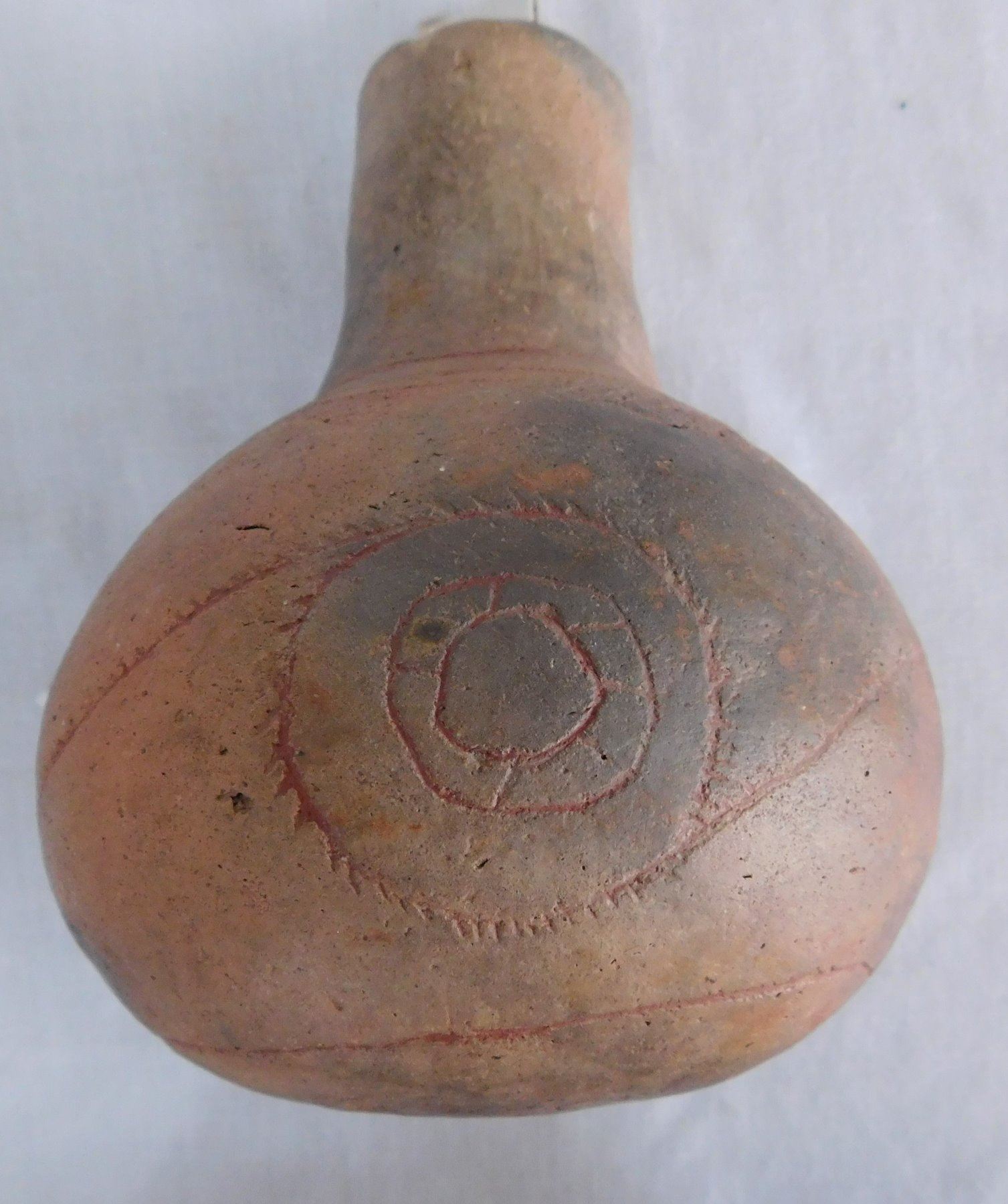 Engraved Caddo Bottle, pre-historic item. Made of clay, the item measures 5 1/2" x 4". Miller County, Arkansas, found in 1984. Condition: Good, see images. Shipping: $24.50 w/insurance and signature, double-boxed.