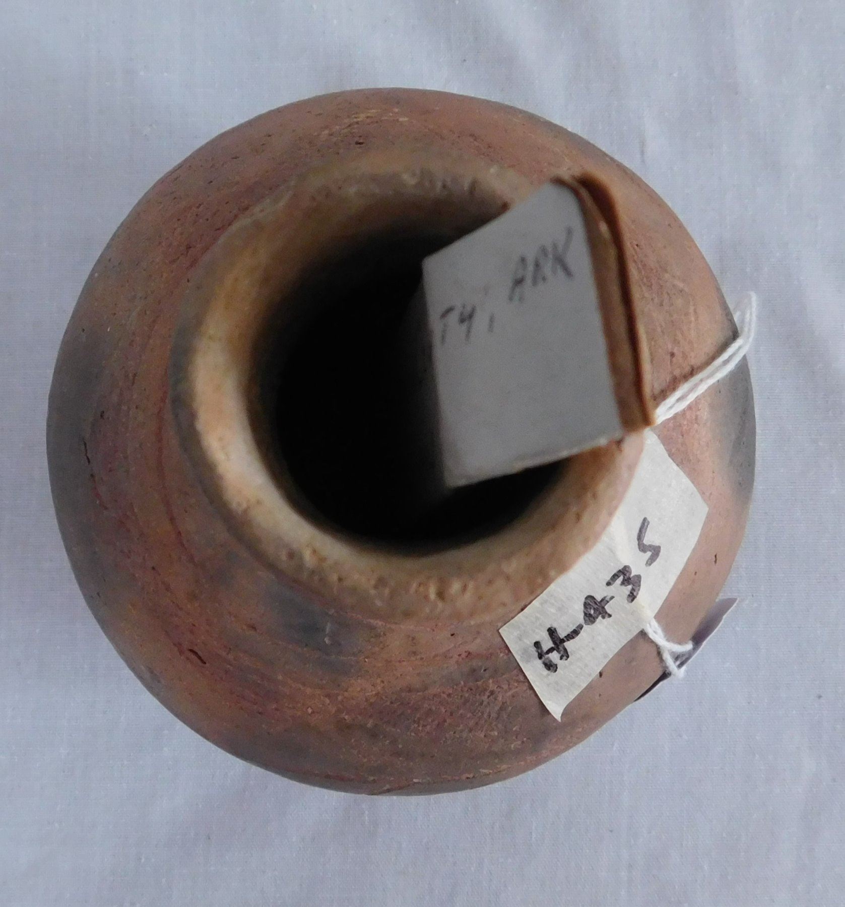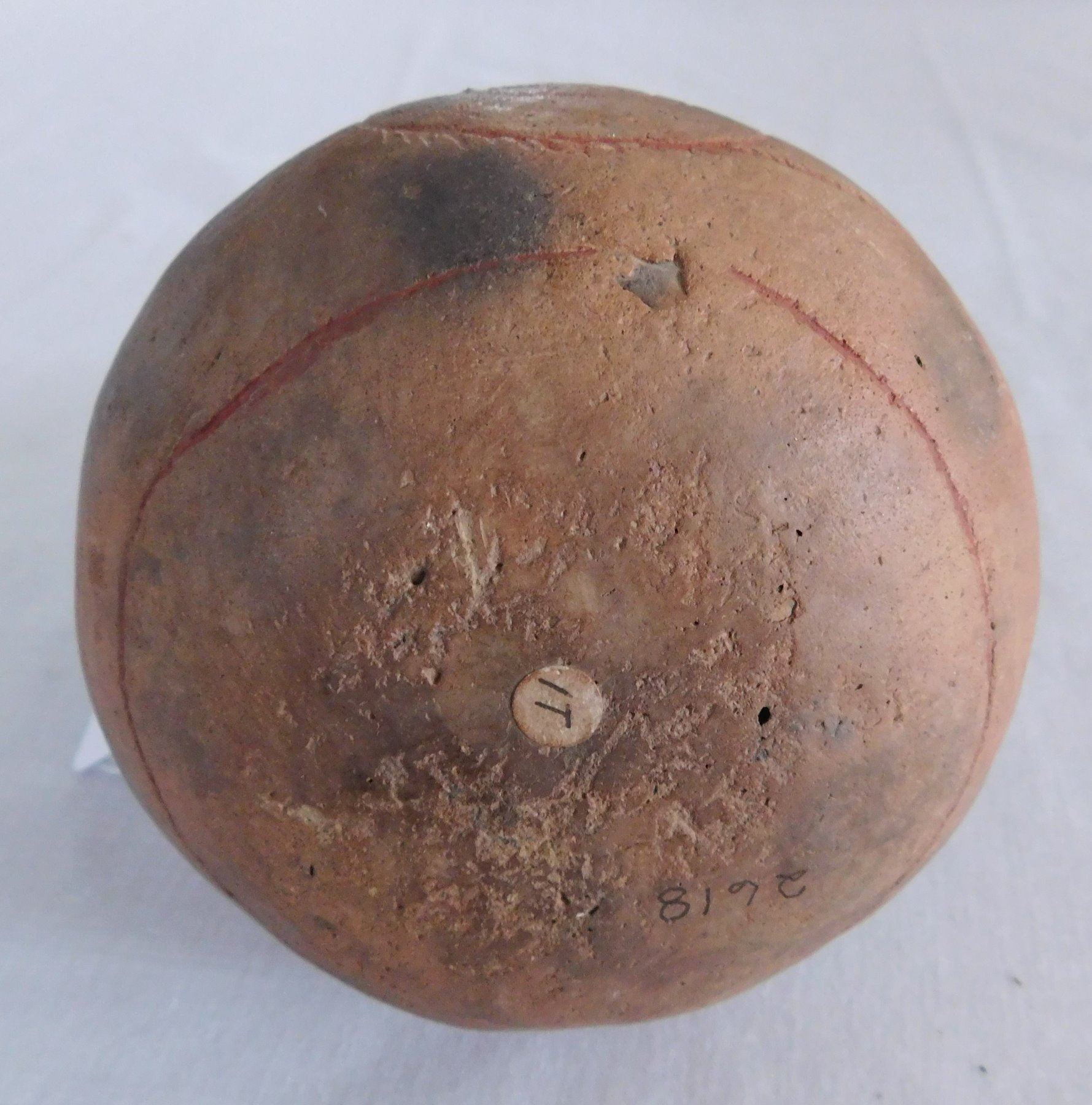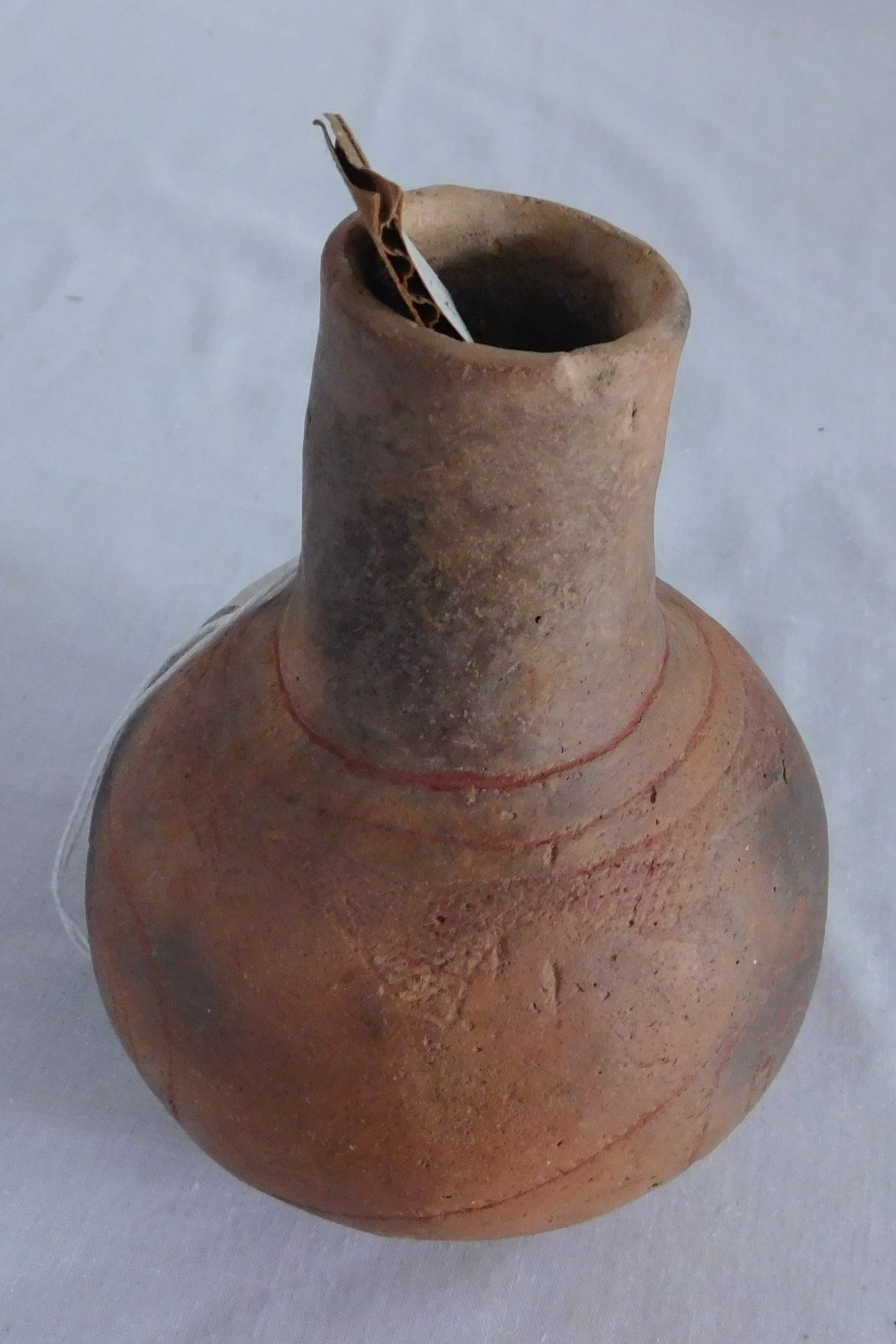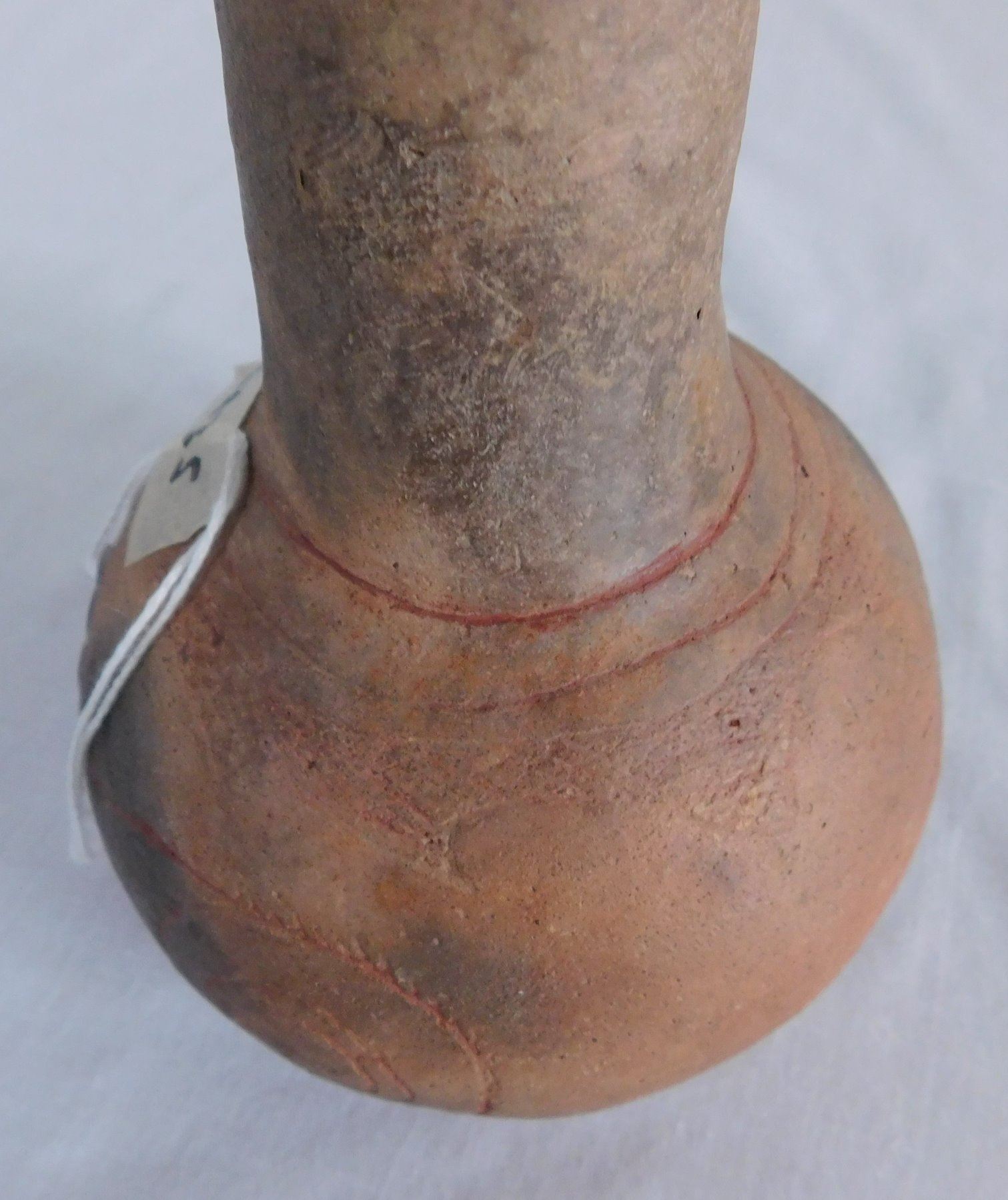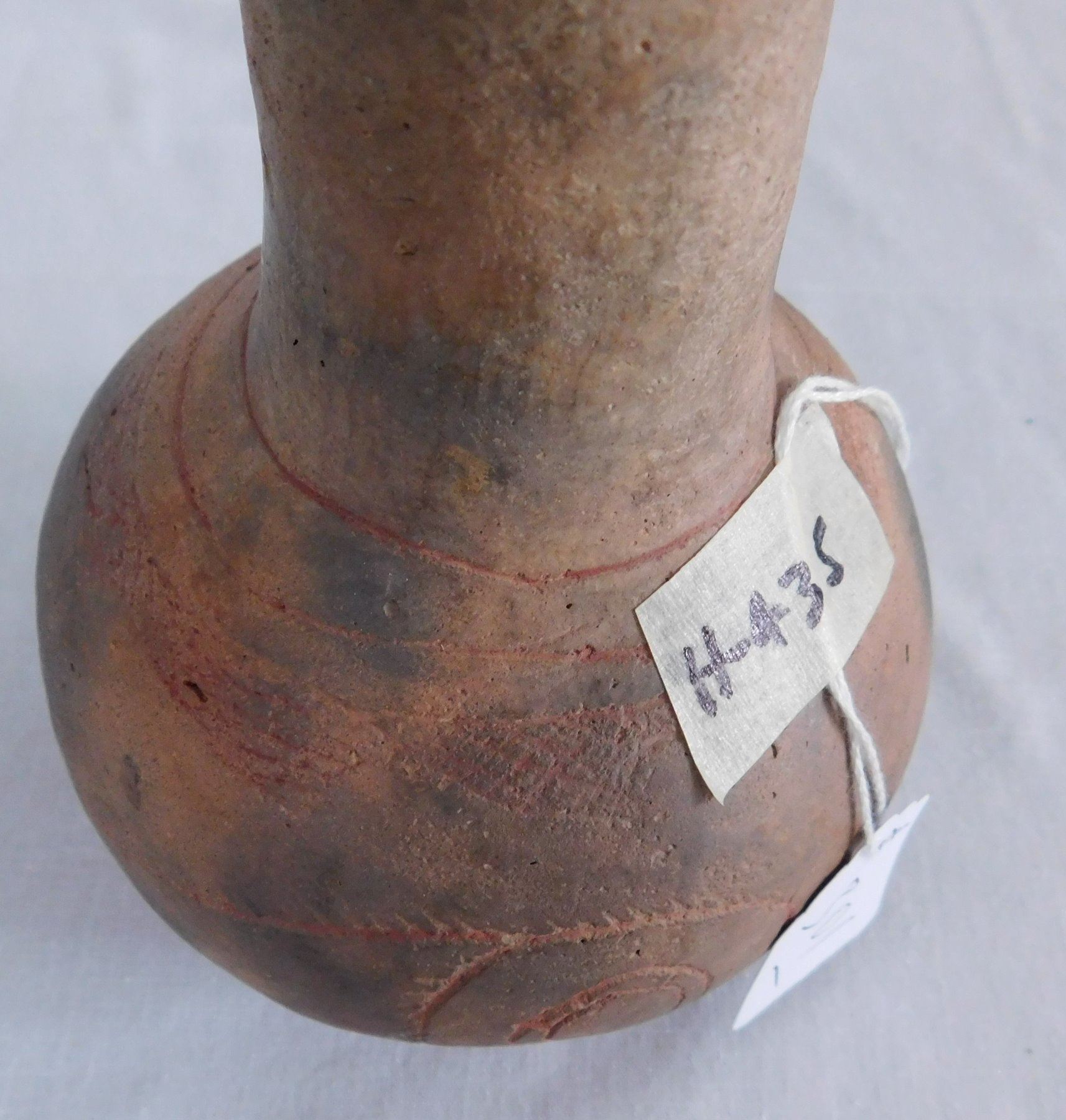 Engraved Caddo Bottle, pre-historic item. Made of clay, the item measures 5 1/2" x 4". Miller County, Arkansas, found in 1984. Condition: Good, see images. Shipping: $24.50 w/insurance and signature, double-boxed.