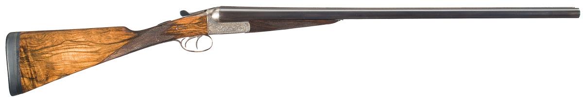 Single bead sight on a concave solid rib marked "CHAS. OSBORNE & CO. LONDON". 2 3/4" chambers, chokes gauge at full and improved cylinder with ejectors. Proofed barrels and water table. Scroll engraved casehardened action marked "CHAS. OSBORNE & CO." on both sides. Scrollwork extends to blued break lever and trigger guard and casehardened forearm hardware. Double trigger with tang safety. Nicely figured checkered splinter forearm and straight grip stock with tear drop stock flats, buttstock initial plate and solid Kickieez recoil pad. Length of pull is 15".