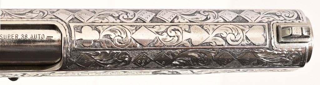 S/N 777 "The Gambler" D.W. Harris full engraved Pre-War Colt 1911 Super 38. Ivory grips, nickel finish, rear target sight. Engraved with scrolls, dice, cards, horseshoe, 4 leaf clover and other motifs. Very nice custom made presentation box