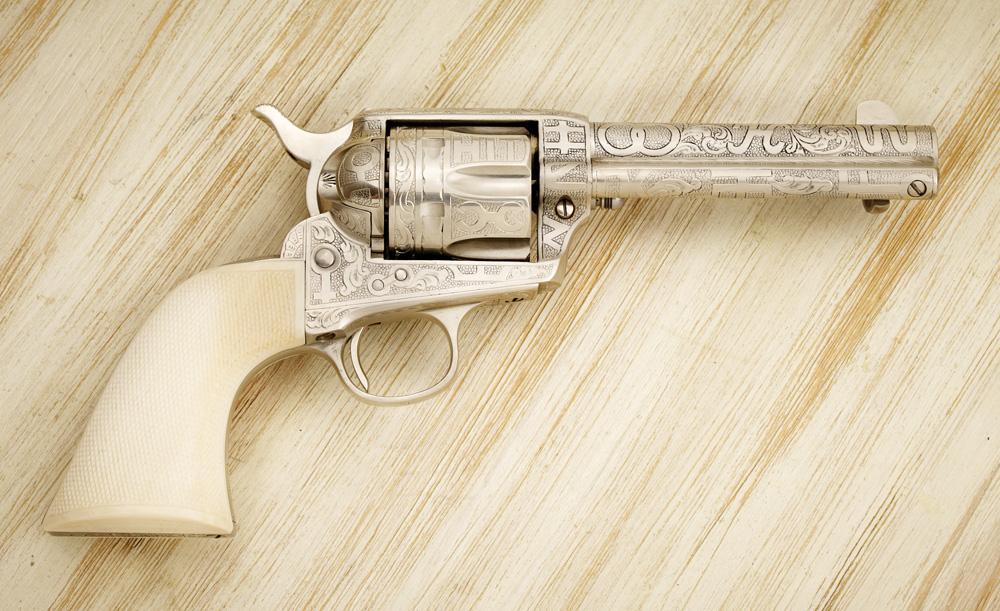 Ser #231849, shipped 1902, 4 3/4” bbl, later cattle-brand engraving, checkered ivory grips. Letter by the engraver David W Harris