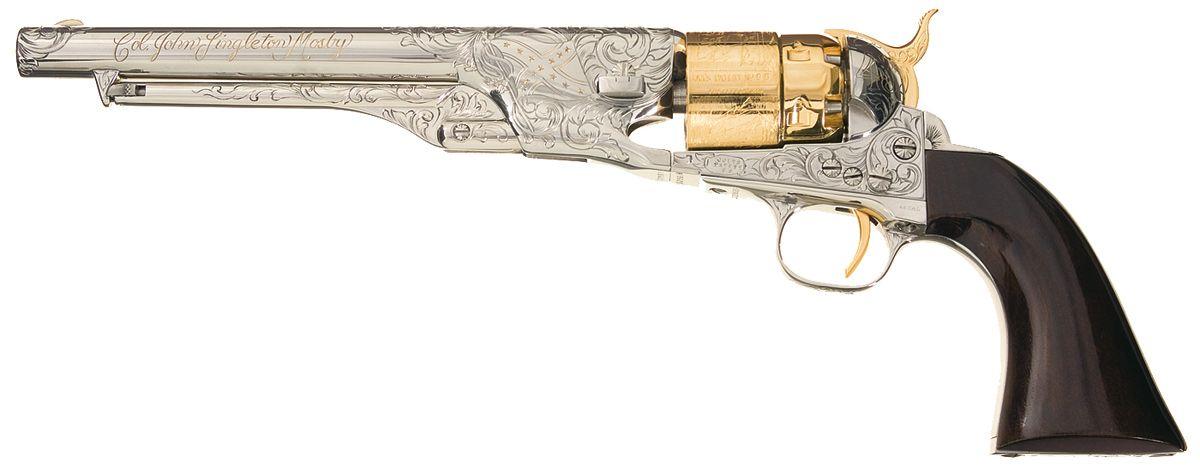 Matching visible numbers with left side of barrel marked in cursive script "Col. John Singleton Mosby". Floral scroll engraving with backstrap marked in a banner "No. 42 of 150". Top of backstrap marked "CSA" with "43rd" in gold on rear frame. Complete with gold Navy scene cylinder.