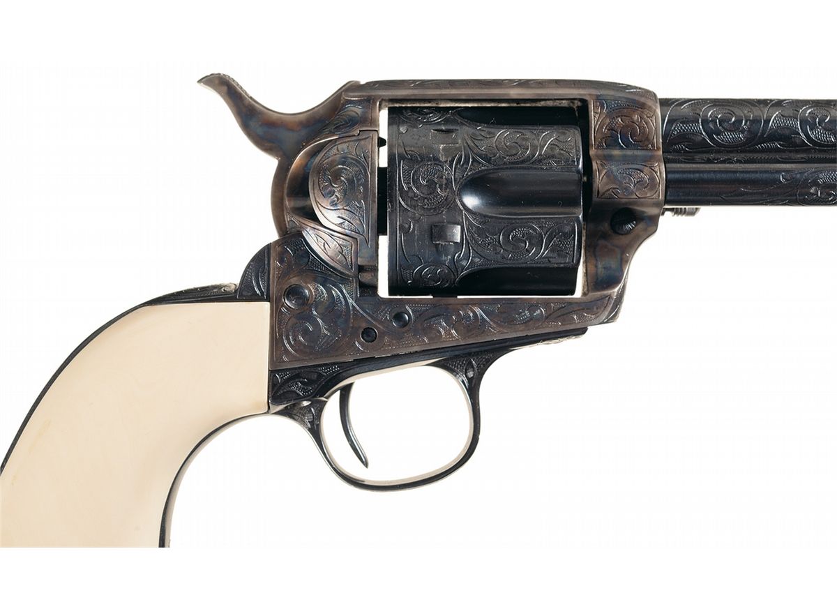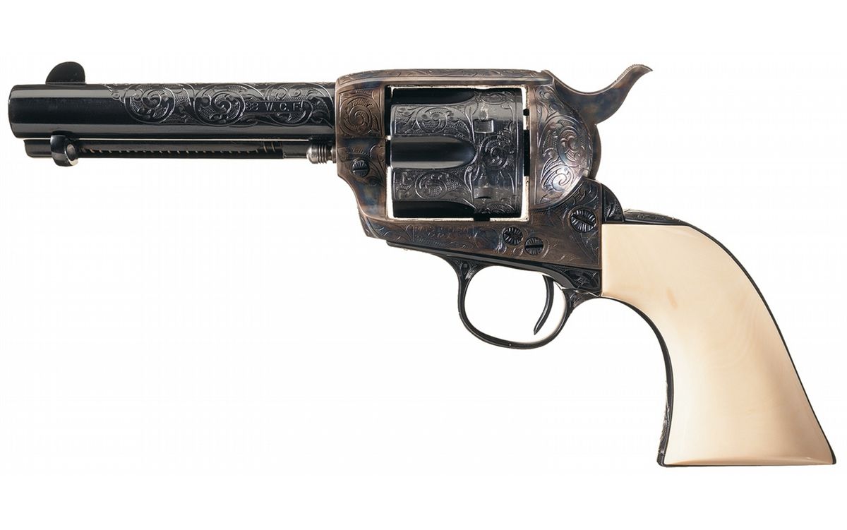 Manufactured in 1908 and subsequently engraved. Floral scroll and punch dot engraving cover the barrel, ejector housing, cylinder, frame, trigger guard and back strap. The top of the barrel is marked with the short two-line address, "38 W.C.F." on the left side and the left side of the frame is marked with the two-line, three-patent dates followed by the Rampant Colt. Blade front and frame notch rear sights, blue finish with casehardened frame and hammer, and fitted with a smooth one-piece ivory grip.