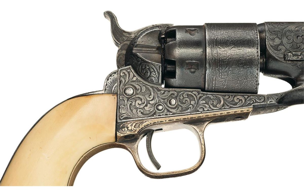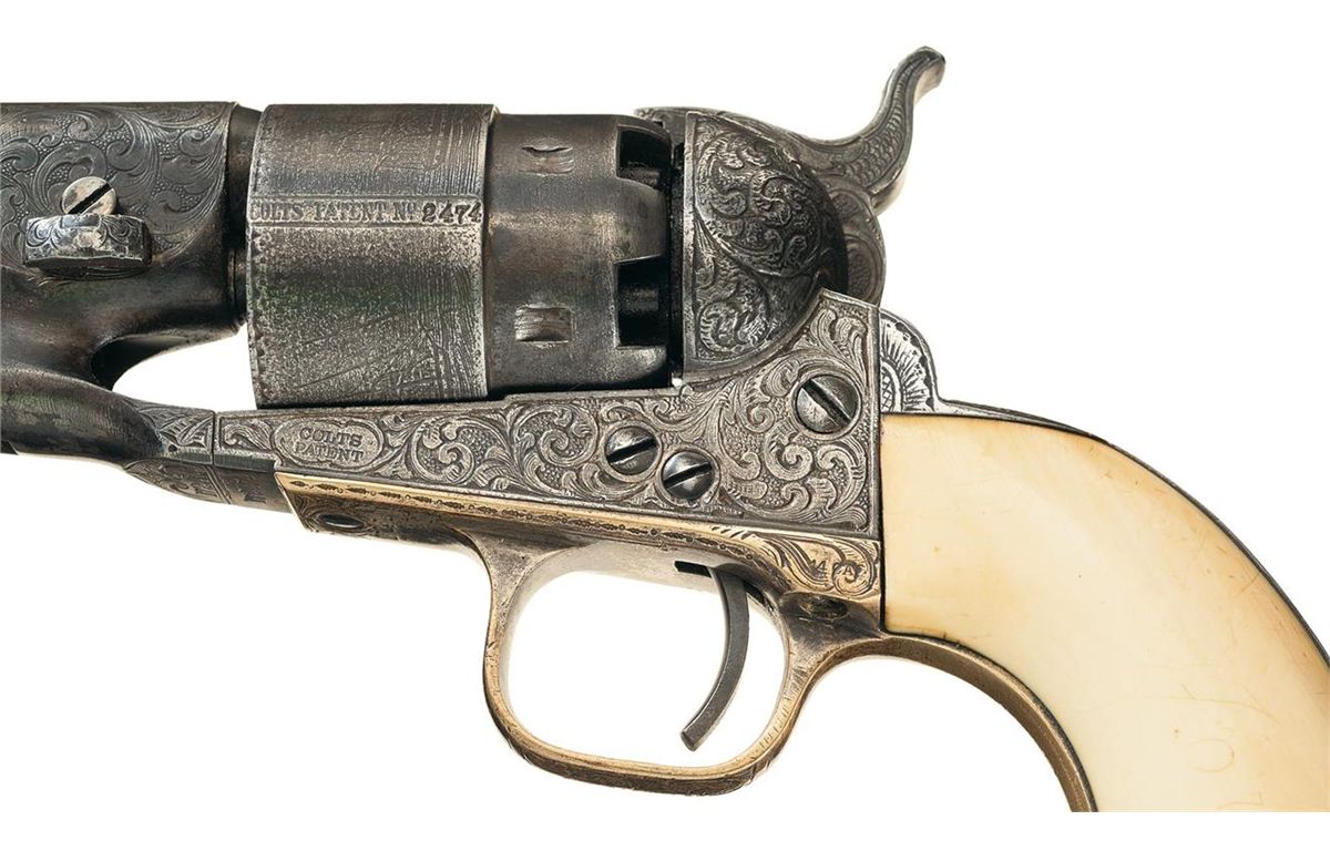 Manufactured in 1868 and subsequently New York Style period floral scroll and punch dot engraved. The engraving covers the sides of the muzzle, rear barrel sides, frame, back strap and trigger guard. The top of the back strap has a shell design and the hammer is engraved with a wolf's head motif. The cylinder is roll engraved with the naval battle scene. The top of the barrel is marked with the one line New York U.S. America address and the left side of the frame has "COLTS/PATENT". The matching serial number is marked on the barrel lug, frame, trigger guard and back strap and the partial serial number "2474" is on the cylinder. Writer was unable to remove the wedge to check the number on the wedge and cylinder pin. Fitted with a smooth one-piece ivory grip.