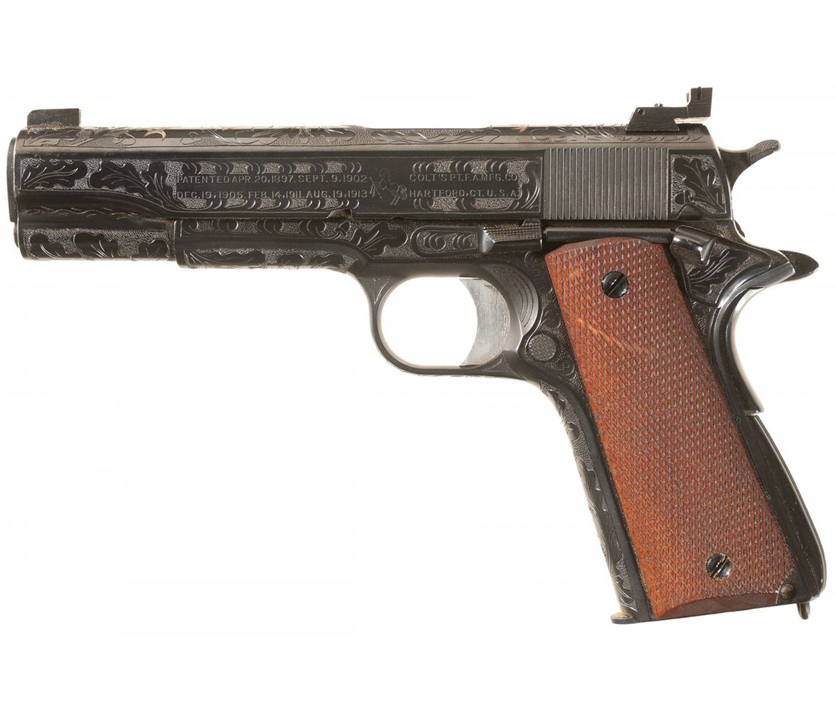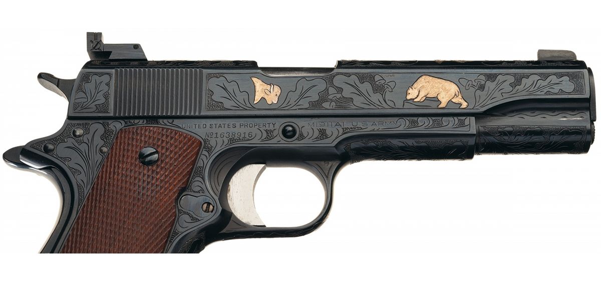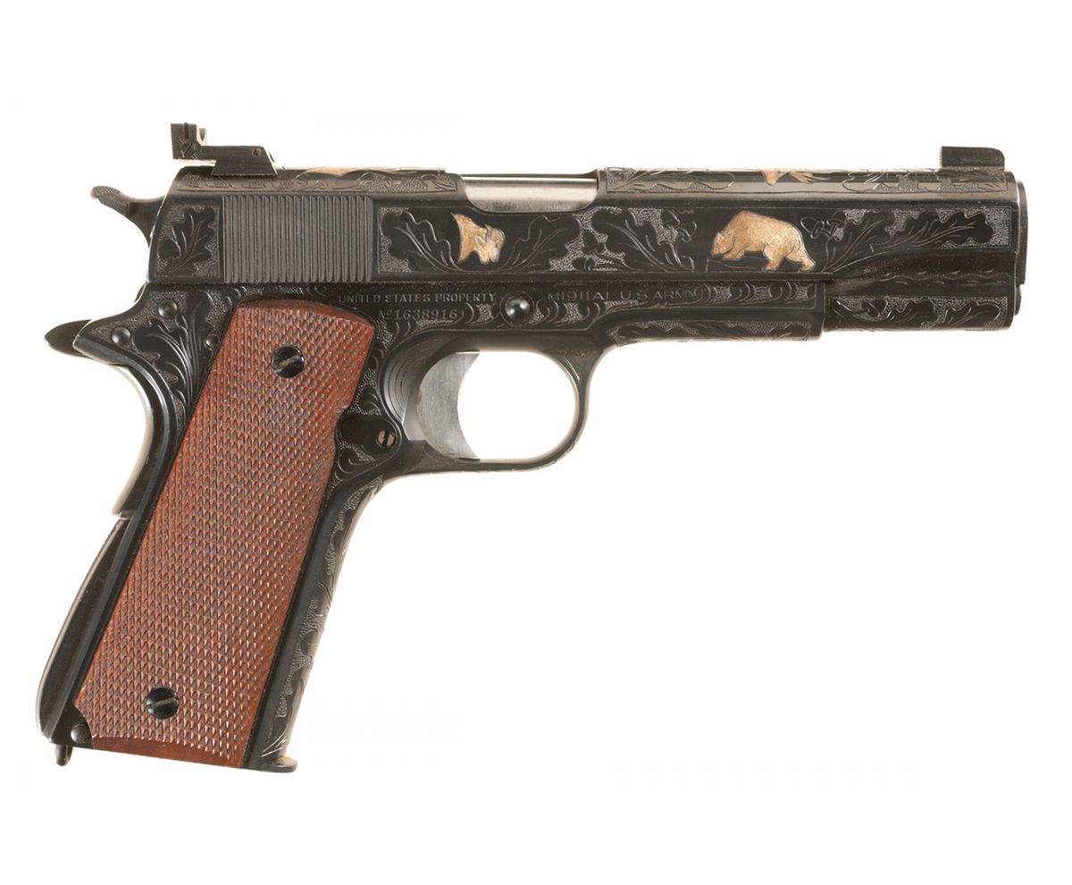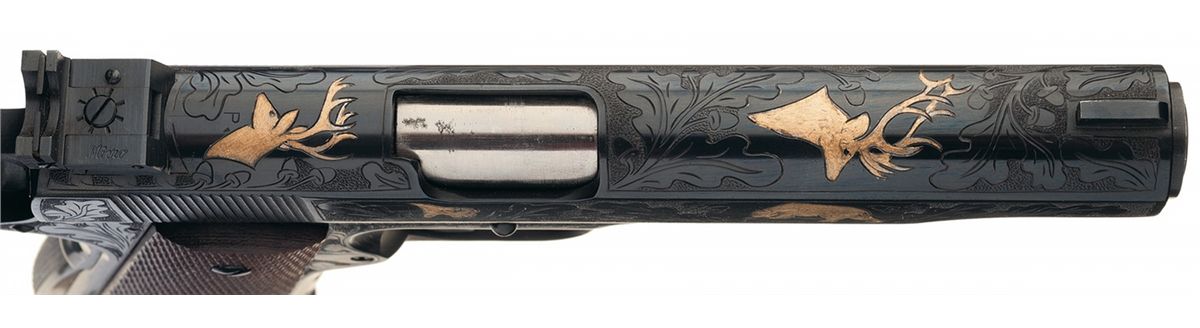 Manufactured in 1943 and subsequently engraved with an oak leaf, acorn and punch dot background design on the slide and frame. The top of the slide also has two buck heads, and the right side features a buffalo head and a bear. The standard markings remain including the "G.H.D." and "P" inspection marks on the left side of the frame.