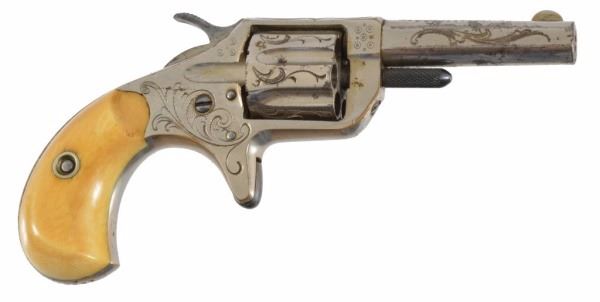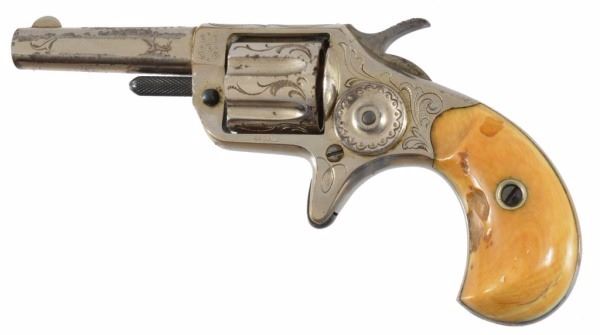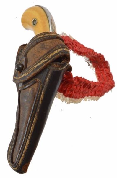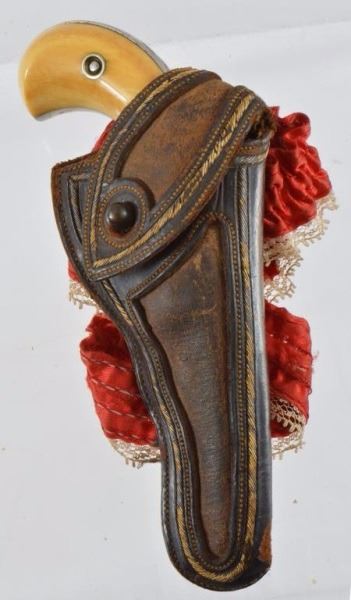 Serial no. 18657 .22 engraved in very good working condition retain most of its original nickel finish. in a period leather half flap garter holster. used garter included.