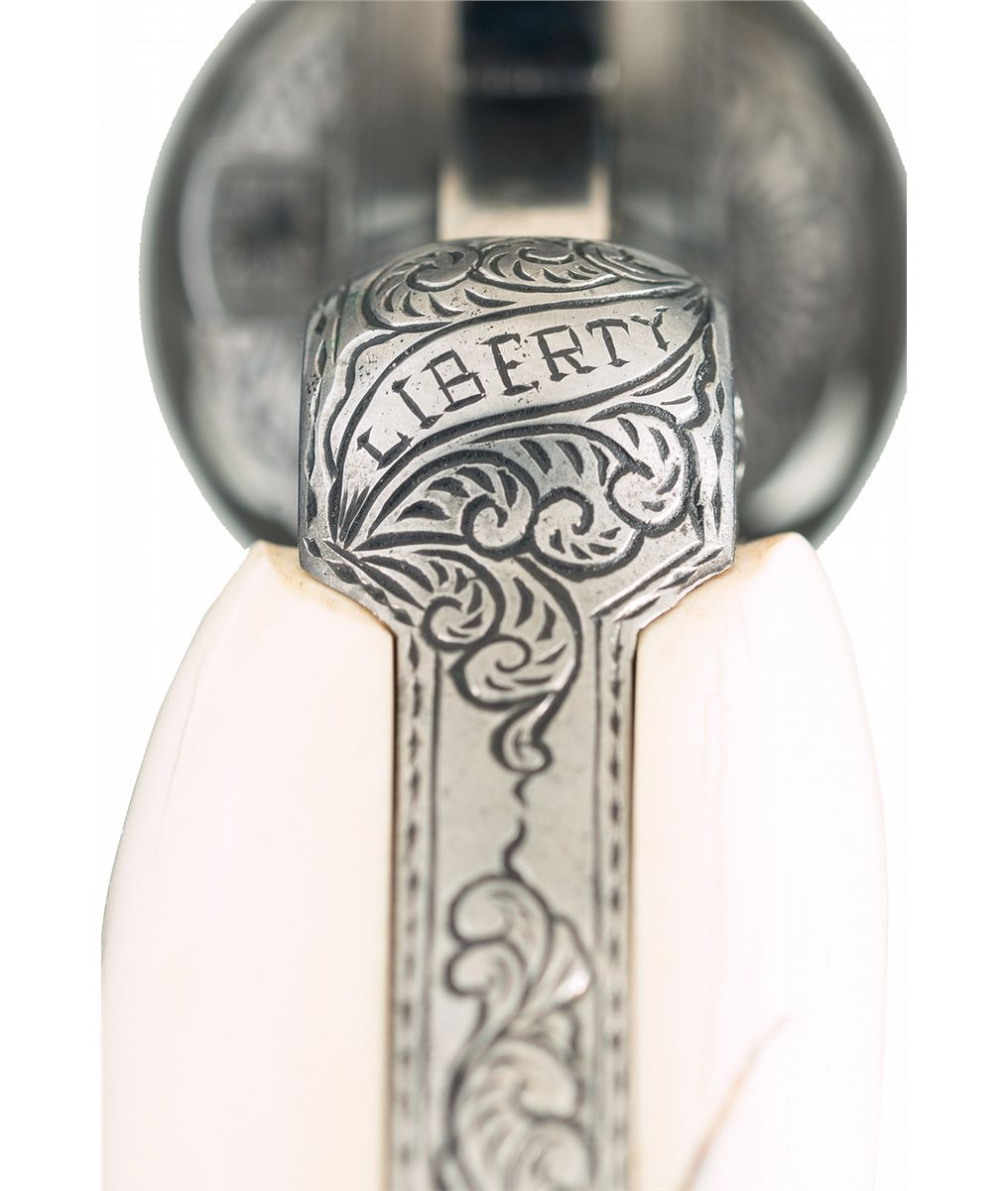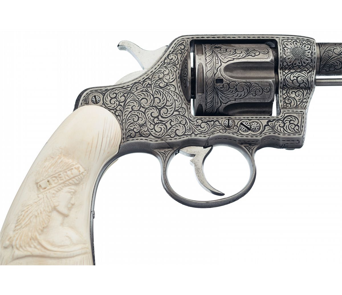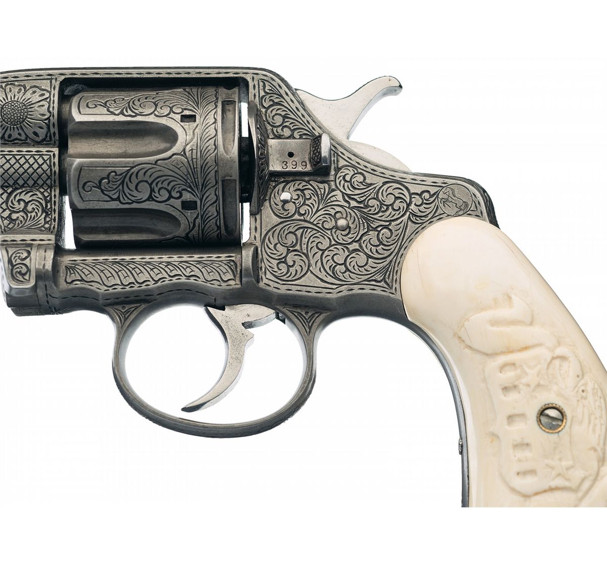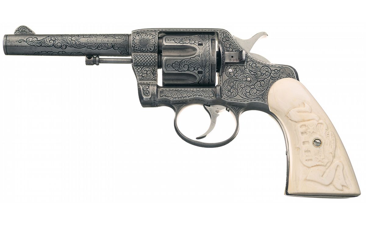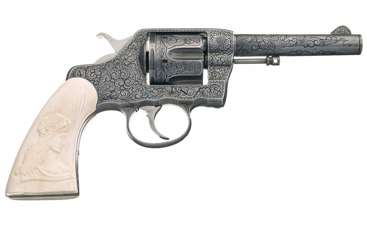 Manufactured in 1898 and subsequently custom embellished in the late 20th/early 21st century with broad floral scroll covering the sides of the barrel, cylinder flats, frame, trigger guard bow and back strap. There is also a floral design on the upper front of the frame on both sides and a geometric design on the crane. The sides of the front sight have a floral design. The top of the barrel is marked with the three-line address/patent dates and "COLT D.A. 41" in a panel on the left side. "LIBERTY" is in a banner on the top of the back strap. The serial number is on the butt, and the matching assembly number (399) is on the cylinder release, crane and frame. Blade front and frame notch rear sights. The revolver has a blue finish with niter blue hammer and trigger, and fitted with ivory grips with a relief carved eagle and shield motif on the left side and the bust of a woman with "LIBERTY" on her head band. The revolver comes in a custom wooden case with green felt fitted lining.