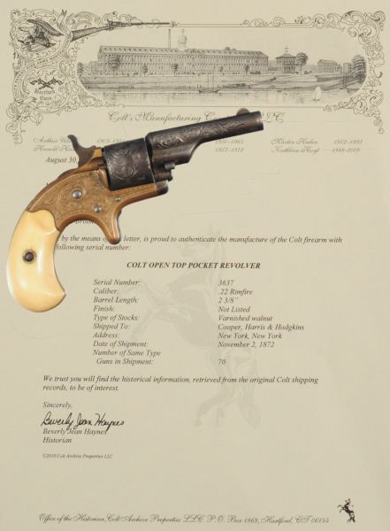 Engraved Colt Open Top .22 Pistol. Ivory Grips. Serial #3637 With Factory Letter.