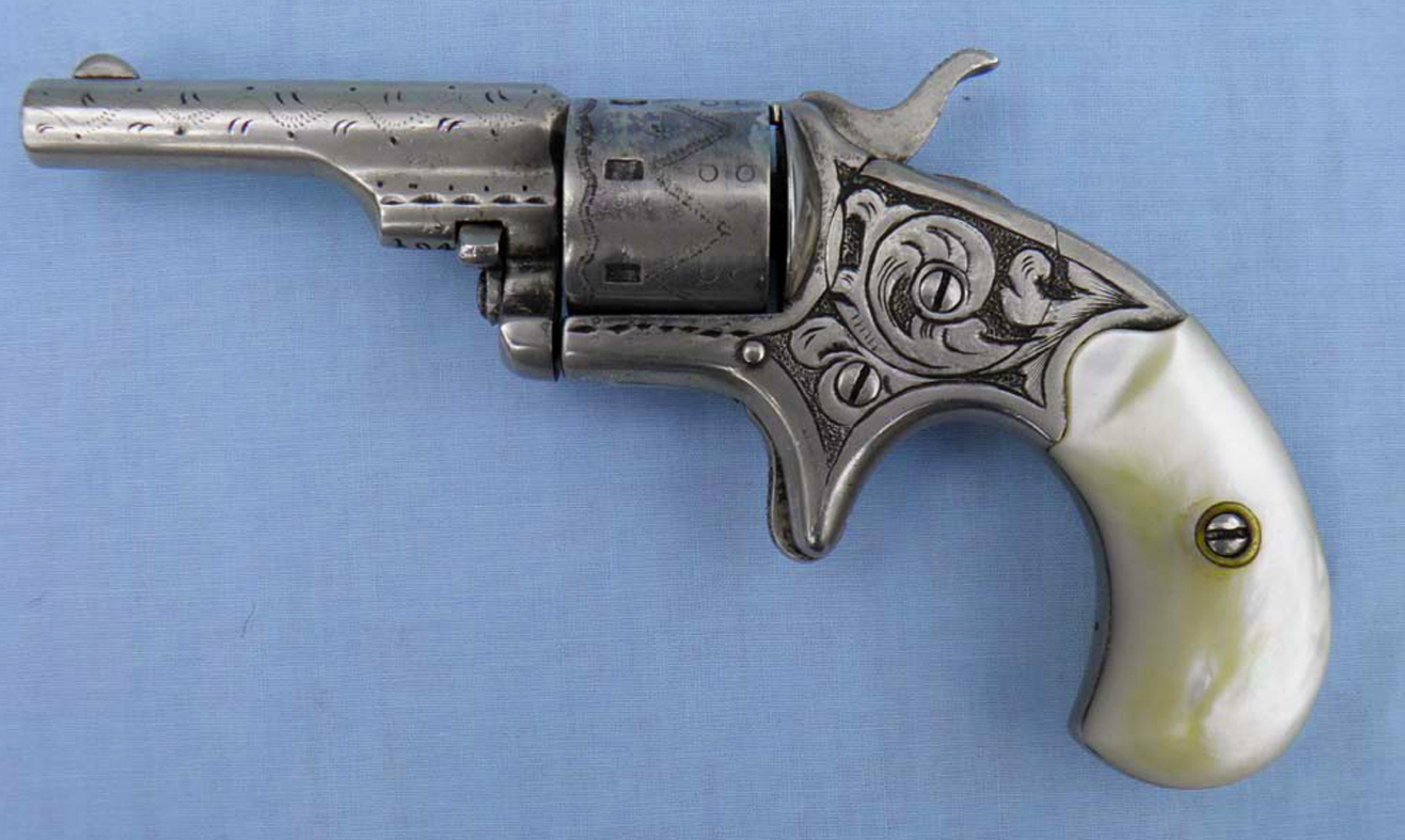 2 3/8” rnd. Bbl., silver/nickel finish, 7 shot cyl, pearl grips, mfgd. 1877, mechanically excellent, scarce.