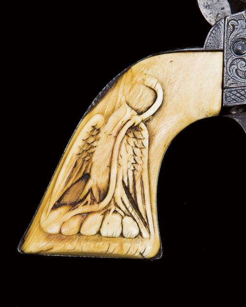 Engraved Colt SAA revolver, .44 RF cal., 7-1/2” barrel, nickel finish, raised carved Mexican snake and eagle ivory grips, #1891. This gun is in overall good condition showing a great untouched appearance with approx. 10% nickel finish remaining in protected areas with the balance of the Colt gone to a dark brown patina with scattered areas of wear, erosion and pin prick pitting; the engraving is period New York-style with excellent coverage; the action is very good, the bore fair; all matching visible serial numbers, three line patent address on left side of frame with all markings clear; the grips are finely worn and accomplished and appear to have been with this gun for most of its life as several loss areas match with erosion and pitting to the inner back straps where the old losses are exposed. The way true collectors love to find these old Southwest Single Action Colts. This SAA revolver, #1891 is pictured in Wilson’s “Book of Colt Engraving”, page 277 which also states “shipped by the Colt plant in March of 1880 to Hartley & Graham, New York; finish, barrel length, and stocks not listed. Revolver was finished and engraved on H & G order, the grips fitted were of Mexican eagle carved ivory . . .”. Est.: $15,000-$30,000.