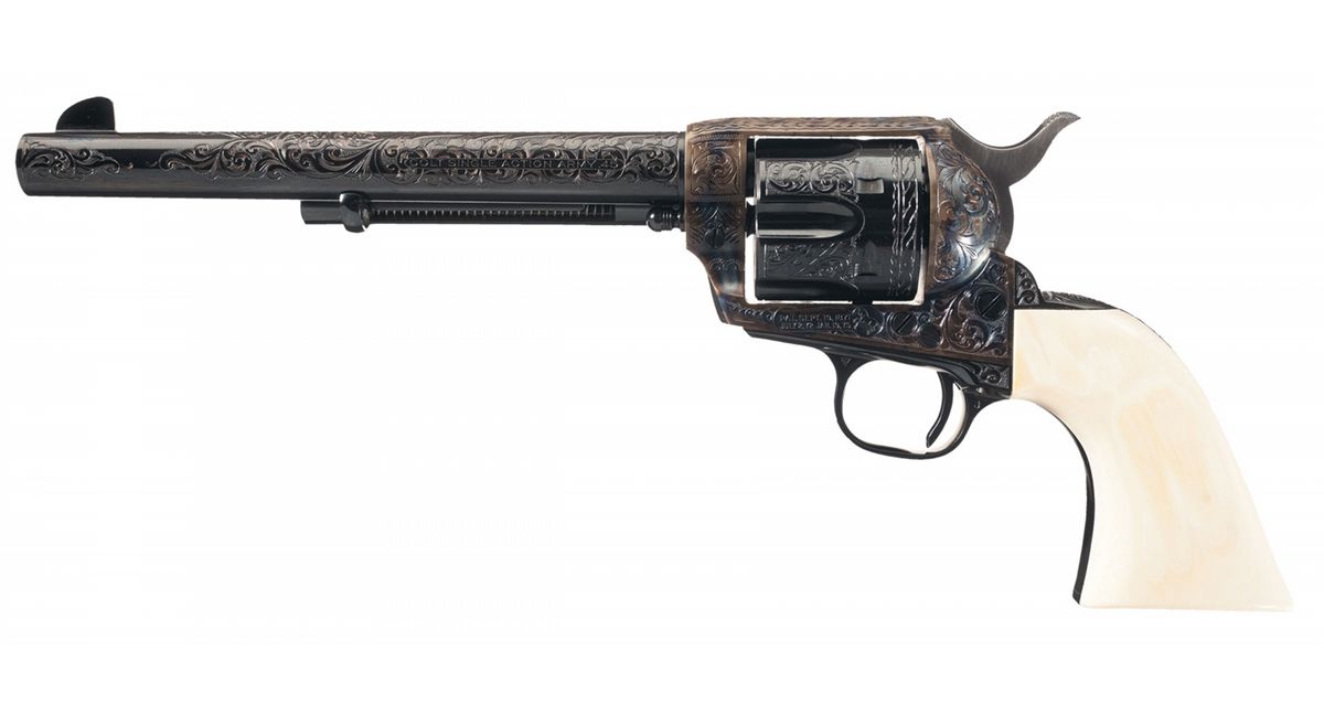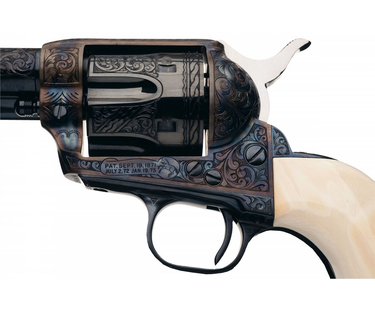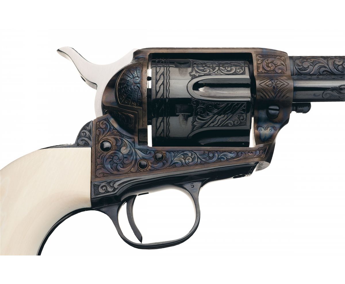 Manufactured in 1957, the second year of Second Generation production. This revolver features approximately 70% coverage of floral scroll and punch dot engraving on the barrel, outer edge of the ejector housing, frame, cylinder flats and back strap. The rear edge of the cylinder also has a rope and scallop design, there is a shell design on the top of the back strap and loading gate, a scollop zigzag and dot design on the top of the ejector housing, a simple vine and leaf pattern on the top strap and a decorative simple line design on the trigger guard and lower front sides of the frame. The top of the barrel is marked with the one line address in a scallop bordered panel, the left side is marked "COLT SINGLE ACTION ARMY .45" in a panel and the left side of the frame is marked with the two line, three patent dates followed by the Rampant Colt in a banner. The matching serial number is marked on the frame and on the grip straps under the grip. Blue finish with casehardened frame and niter blue trigger and hammer with polished sides. Standard fixed sights and fitted with a smooth one-piece ivory grip. No factory letter is available at time of description, so it will be offered as custom engraved.