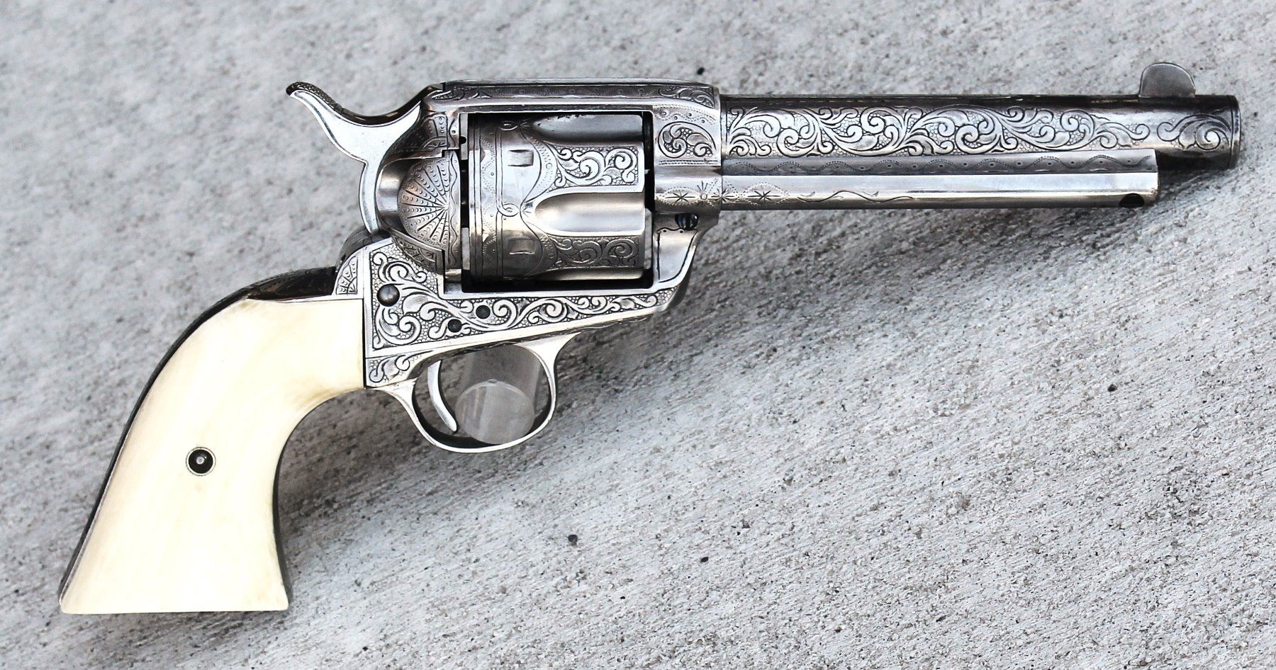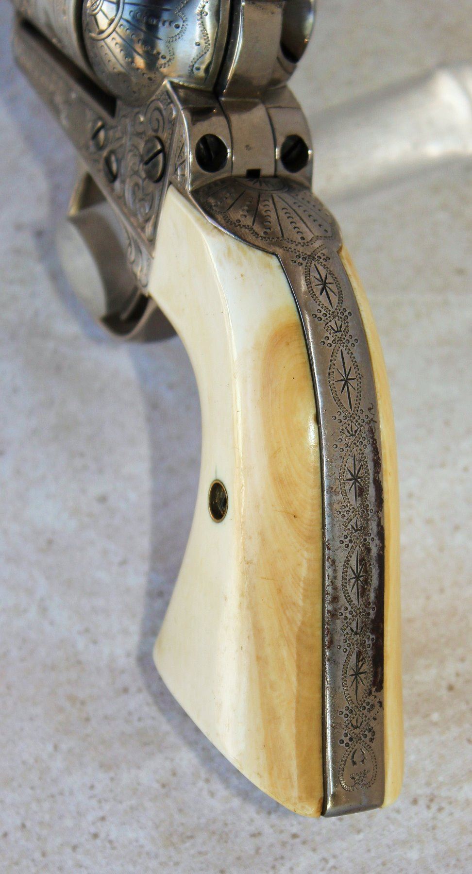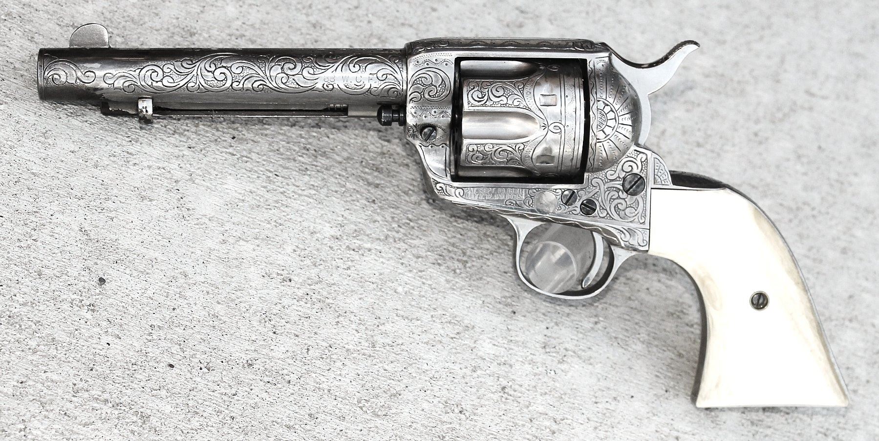 A very attractive full coverage scroll engraved 5 1/2" Colt with ivory grips, chambered in 38WCF, showing 95% of its old nickeled finish, and all matching numbers. Ser.#281xxx. C&R