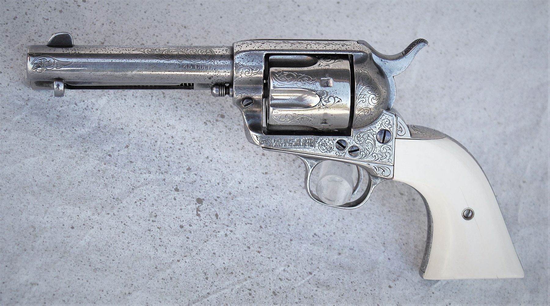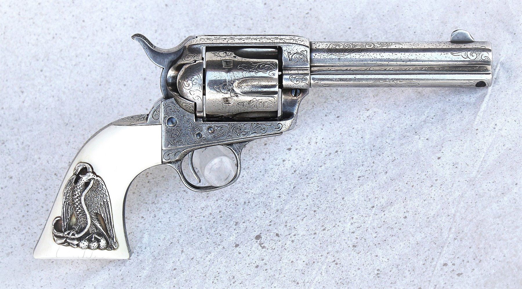 A black powder frame Colt with fantastic eye appeal, having stylish engraving, 90% nickel finish and wonderful ivory grips mounted with silver Mexican eagles. Chambered in 45 caliber, and having all matching numbers with a desirable 4 3/4" barrel. Ser# 192xxx. C&R
