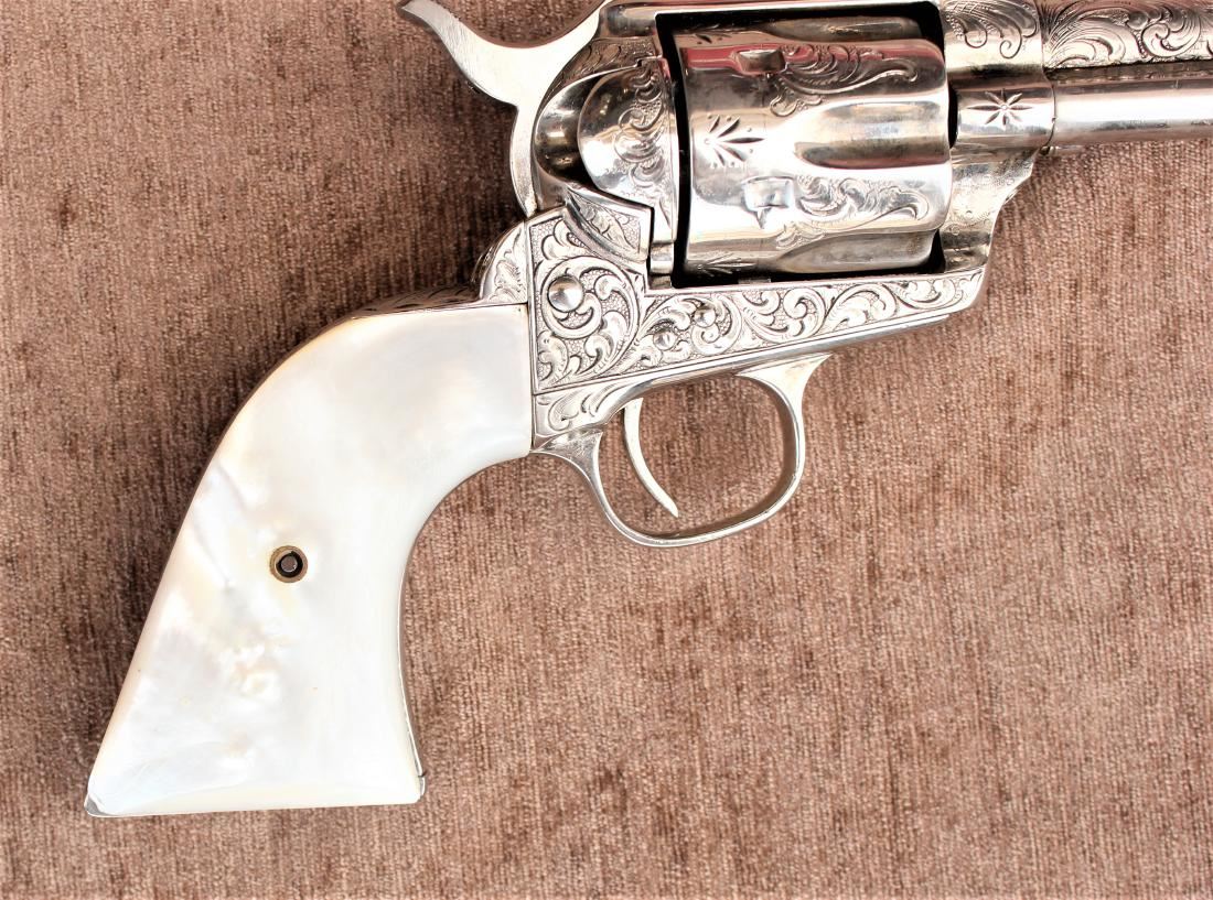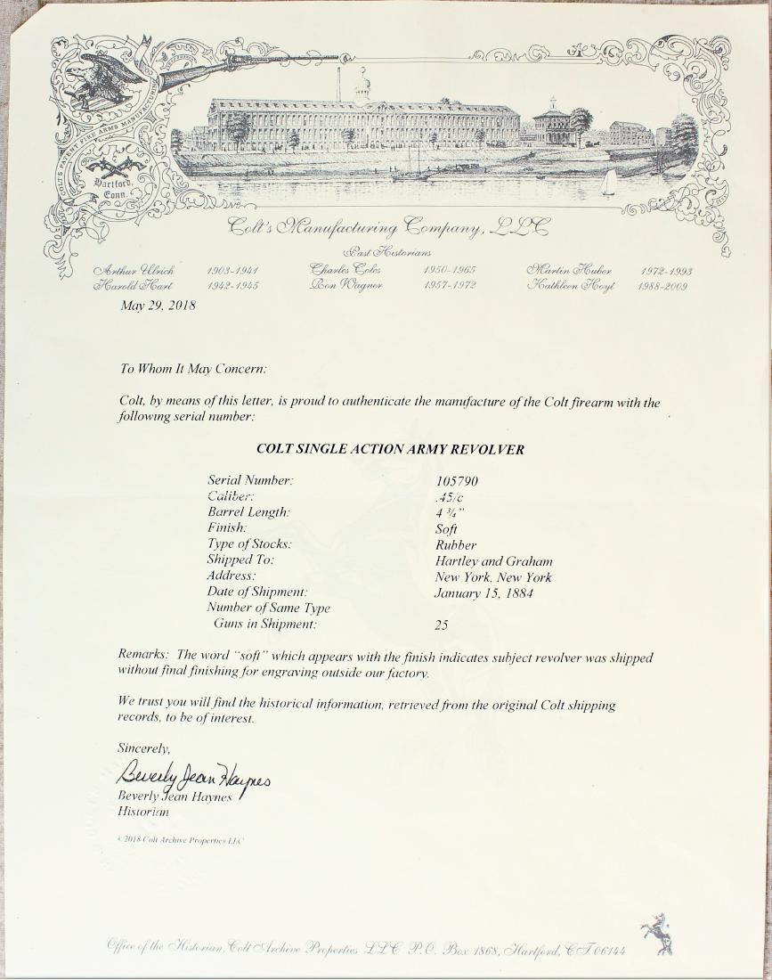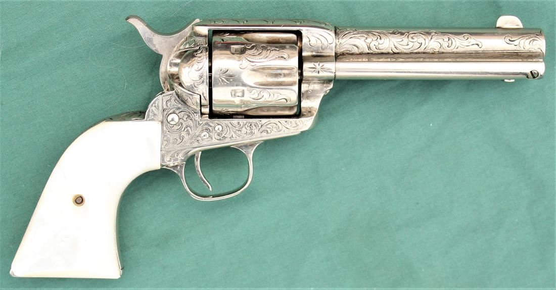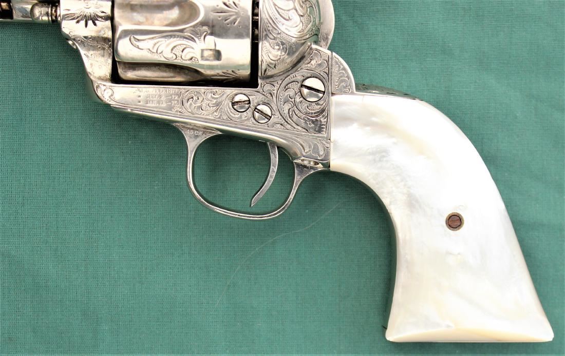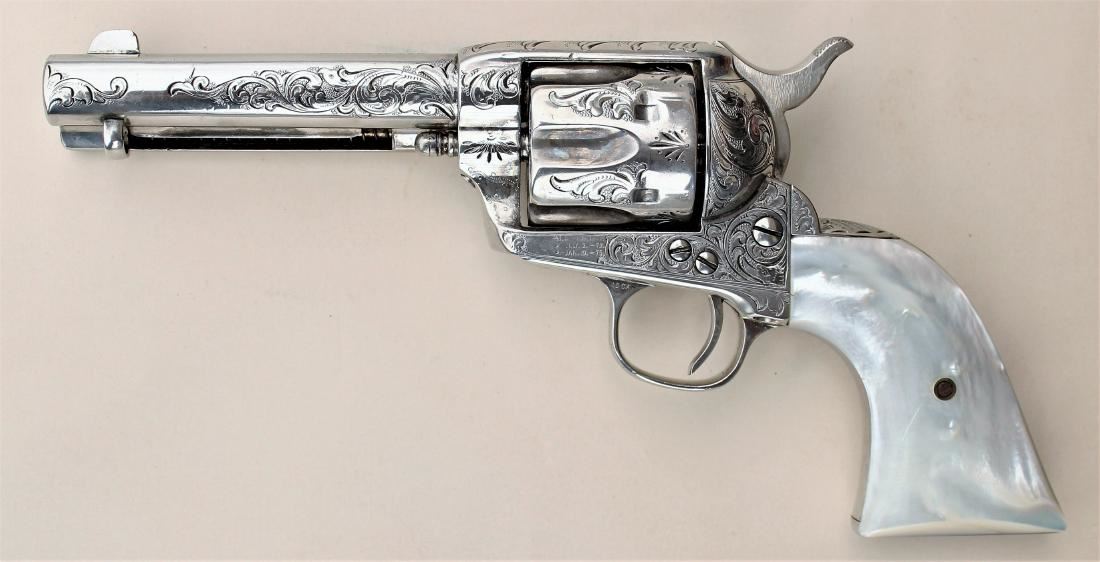 Wonderful New York engraved Colt revolver, shipped soft to Hartley and Grayham, to be engraved, in 1884, with 4 3/4" barrel and pearl grips. Revolver remains very good showing an early renickeled finish, matching visible serial numbers, good visible marking include 2 line barrel address, 3 line patent dates and 45 cal designation on trigger guard flat, grips have good fit to metal. Factory letter confirms shipped soft, with rubber grips, on Jan. 15 1884. Good functioning action, and very good bore.