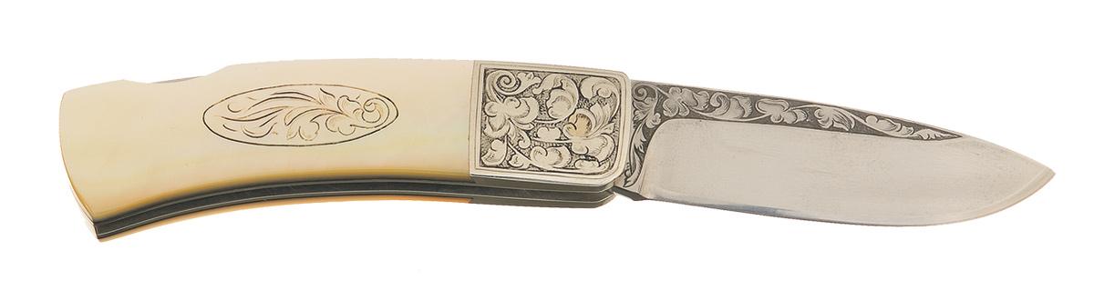 The folding knife has a 2 inch blade with a floral scroll engraving on a punch dot background on the flat surfaces. The spine of the blade and blade release mechanism feature a floral engraving, with the initials "PB" on the release mechanism and "JK" on the rear of the tang. Left front bolster engraved with mountain lion head and right front bolster has a floral scroll engraving on the punch dot background. Pearl scales with scrimshawed floral pattern. OAL: 5 1/4".