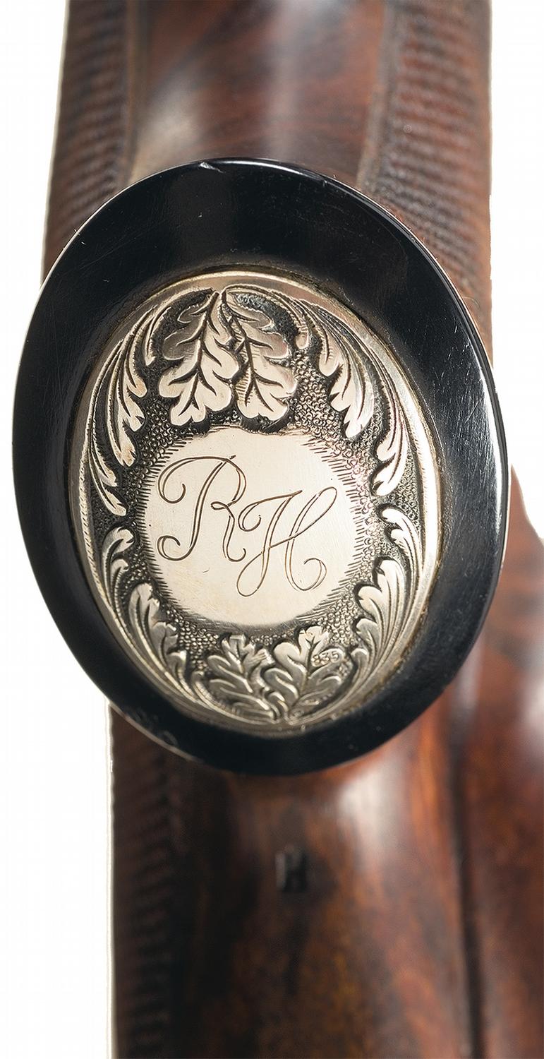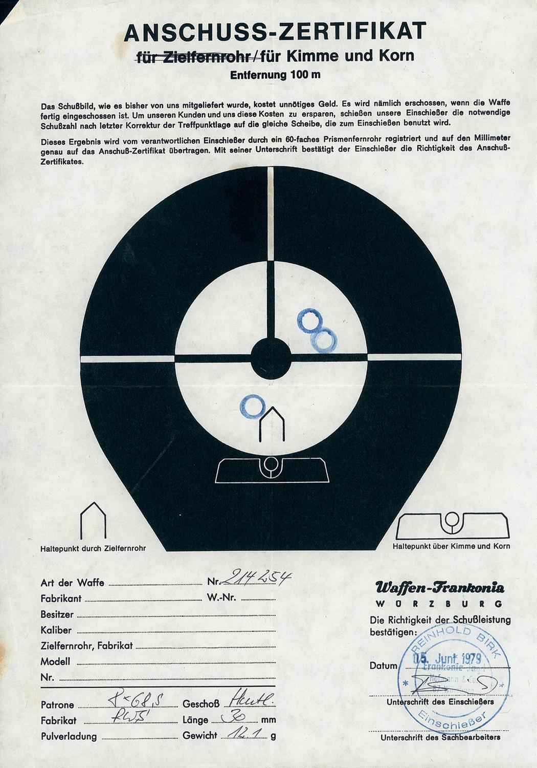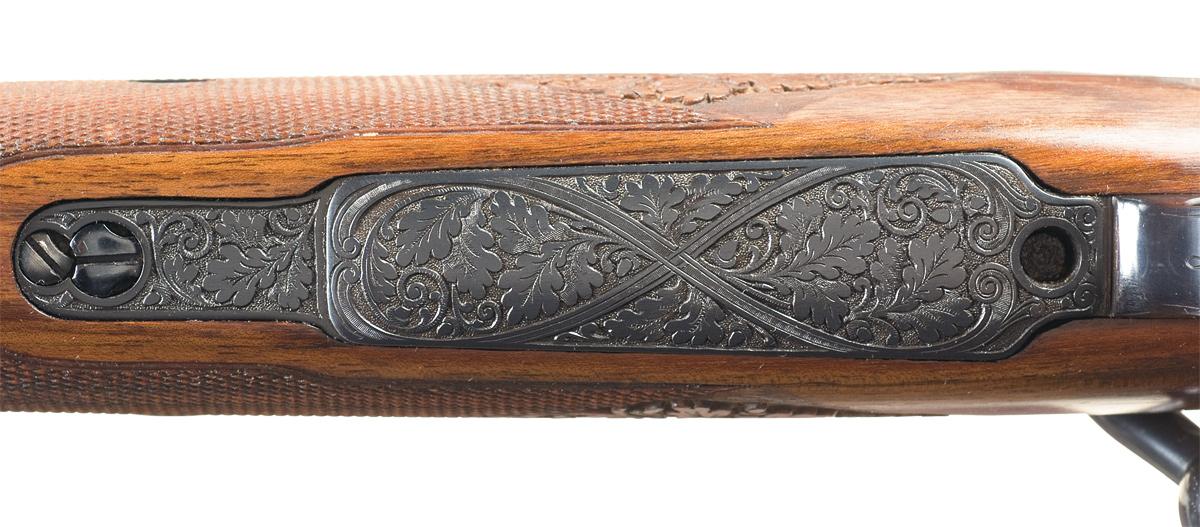 Ramp bead blade front sight and windage adjustable rear leaf sight, with oak leaf and punch dot engraving on the sling swivel band, rear sight base and down the sides extending from the breech, along with commercial proofs and serial number on the left side. One line Mauser address on receiver sidewall, with caliber markings, flattened safety, oak leaf engraved trigger guard and floor plate, double set triggers and a Kahles (Vienna) Helia-Super 6 S2 scope with quick-detach EAW twist off mounts. Custom dog leg style checkered pistol grip stock with carved oak leaf accents, raised shadow line cheekpiece, engraved silver grip cap with "RH" initials and a vented Wegu recoil pad. With a set of proof papers from Waffen-Frankonia, an outfitter operating out of Wurzburg, dated 15 Jun 1979.