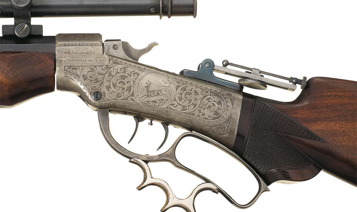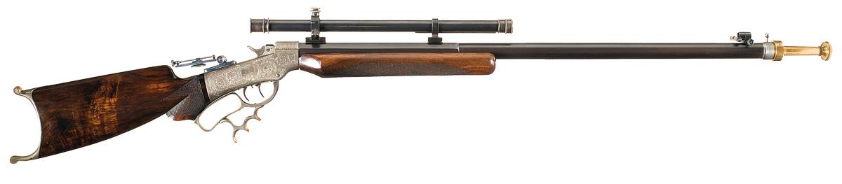This custom engraved Pope Marlin Ballard rifle features a one third octagon barrel marked "H. M. Pope" on the left and right flats and "395, AE, small star mark," and "40" on the bottom flat, with a false muzzle numbered "395", brass bullet starter, and a spirit level windage front sight. Equipped with a Lyman 5A scope mounted on target blocks. The left side of the #6 1/2 Rigby pistol grip action is marked with the two line Marlin address/Ballard's patent date, and engraved with a floral scroll pattern with punch dot background and a dot and heart shape border, running deer scene on the left and a running buffalo on the right. Mounted with a checkered Marlin pistol grip stock with a black walnut beavertail forearm and a Swiss style nickel plated brass buttplate.