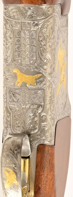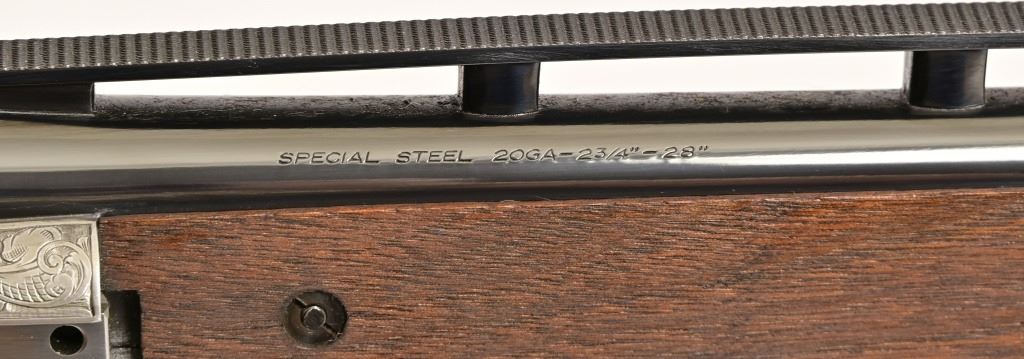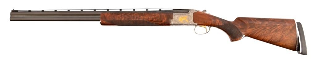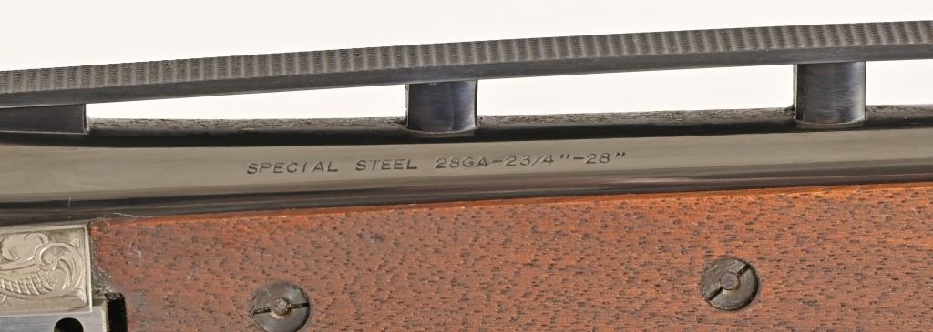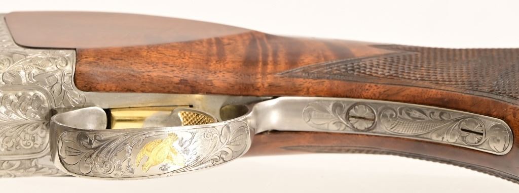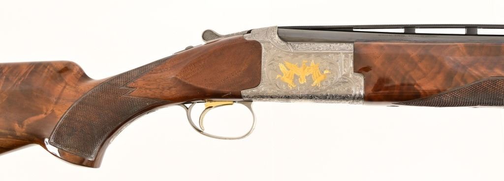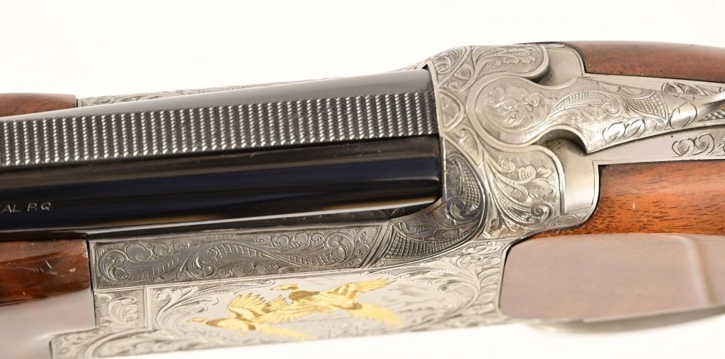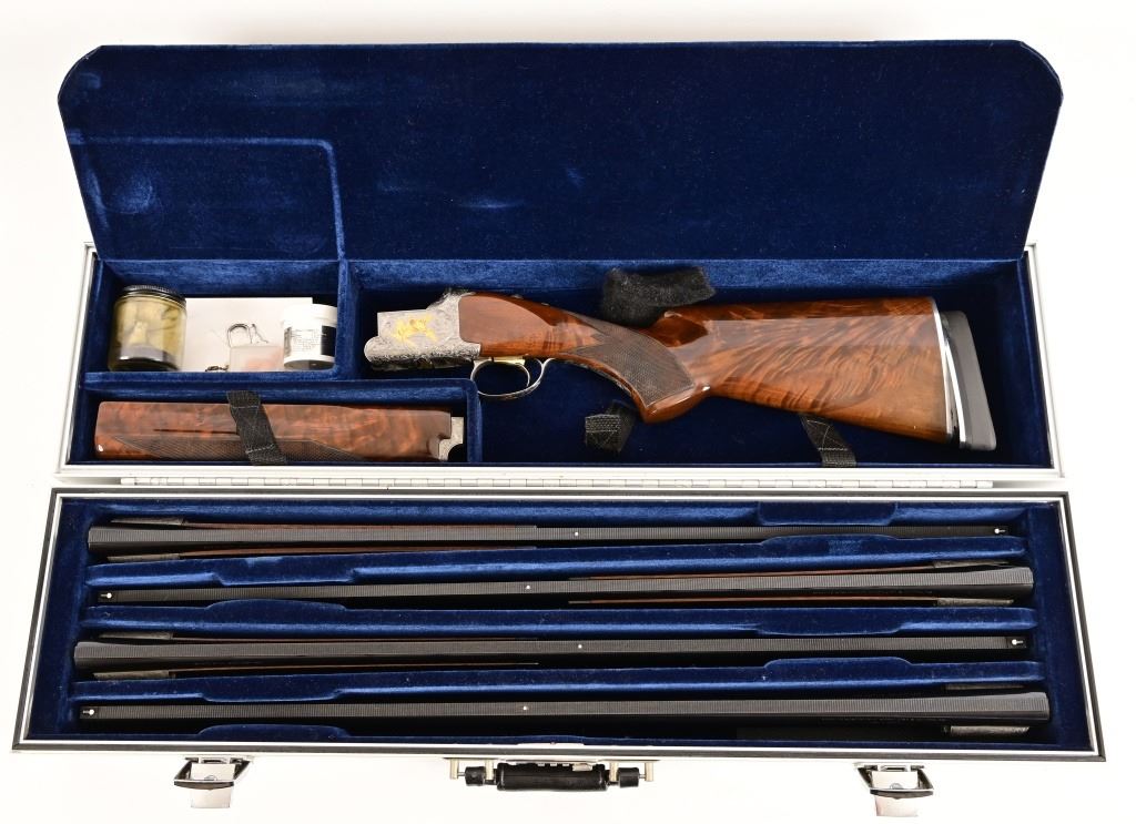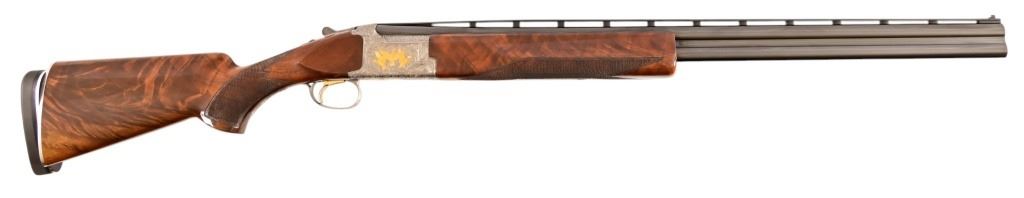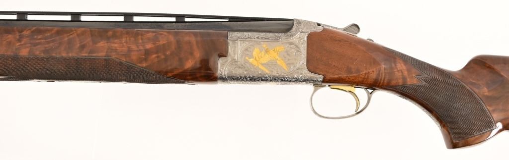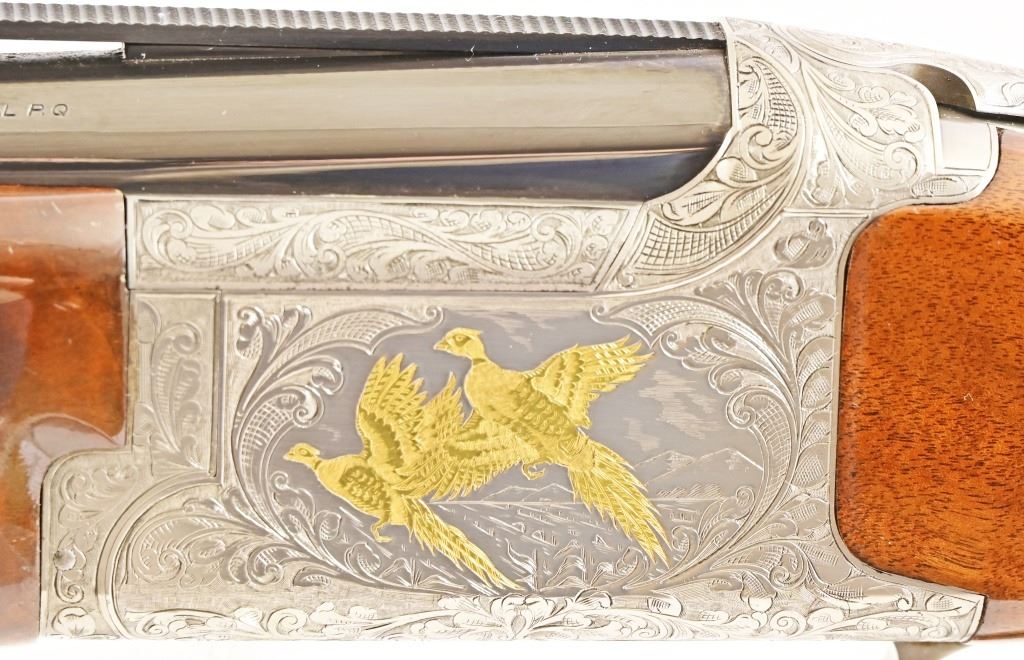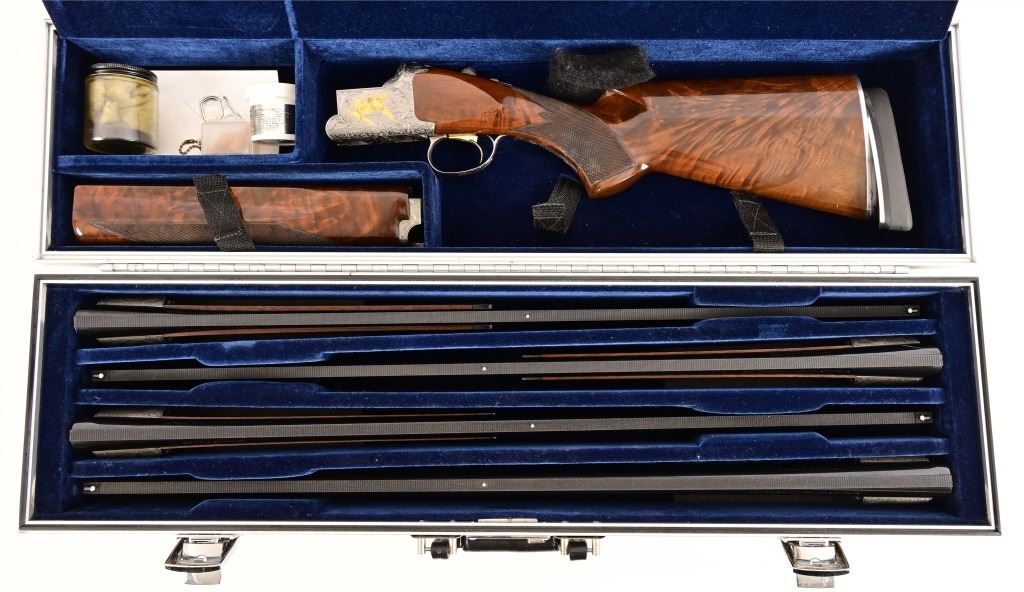 S/N 17550NM6A3. Engraved receiver with gold pheasant scene. Deluxe checkered stock. Four 28-inch barrel sets ranging from .410-12 Gauge. Modern
