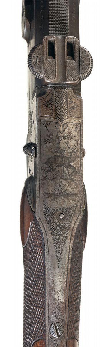 The sides and bottom of the receiver, the break lever and top tang have nicely executed tight floral scroll engraving. The top of the receiver is engraved with a red stag in a field scene. The barrel has a nickel beaded blade front sight and a drift adjustable rear sight. There are claw mounts at the rear of the barrel. The bottom of the barrel is stamped "2667" and "172/28" along with the German proofmarks. There is a safety on the left side of the receiver and double set triggers. Mounted on a checkered walnut forearm with Schnabel tip and straight grip stock with raised cheekpiece and smooth steel buttplate. There is a German silver banner inlaid in the right side of the stock that is engraved "Jac. Gebursh,Mainz". With a set of Hornady 8.15x46R full length reloading dies.