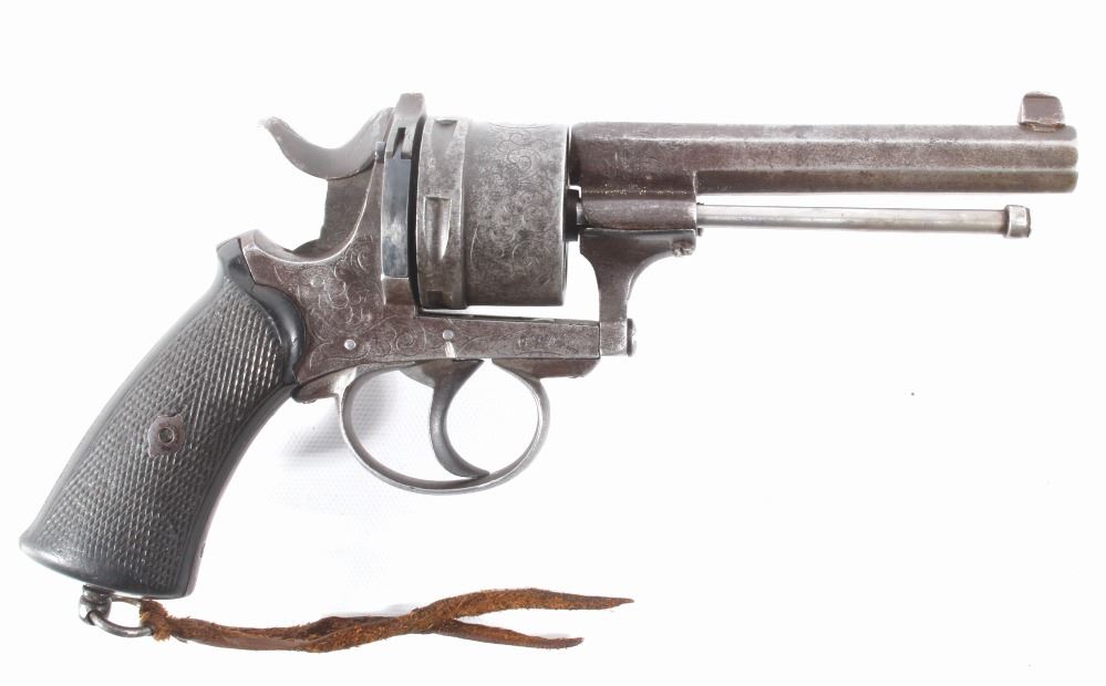 You are bidding on a Engraved European .45 Caliber Center Fire Officer's Double Action Revolver. The revolver features a 4 1/2" octagon barrel, hand checkered walnut grips, extractor, engraved, and blue'd finish. This beautiful high grade revolver dates to the 1870-1880s period and displays the popular Adams or Trantner style of manufacture that was widely used and popular with officers of the time. The scroll engraving I well executed and the revolver bares the serial number 6303. Beautiful and attractive aged patina metal that shows no sighs of being rusted, pitted, abused or over-cleaned. Original checkered dark walnut grips are excellent and the grip straps retain the original lanyard swivel (these usually missing). Octagon barrel is 4 ½” long and has the original dovetailed blade/bead front sight matched with a pronounced pinched groove ahead of the hammer. Loading gate intact. This high quality revolver was probably chambered for the popular .450 Eley or .455 Eley cartridge, complete with extractor rod mounted on the side of the frame and excellent rifled bore. This is a antique firearm. NO FFL transfer or NICS background check required. The serial number 6303