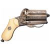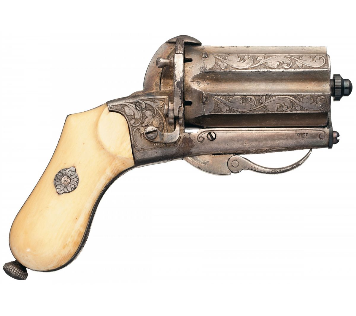 Condition: Excellent. The pistol retains 95% of original silver plating with the balance a smooth silver-gray patina. The grips are very fine with a couple small hairline stress cracks. The ivory has an attractive color and grain pattern. Action functions but needs work due to hammer not releasing. The engraving is crisp.