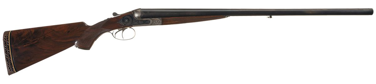 The receiver, side plates, break lever, trigger plate, trigger guard and a small portion at the rear of the barrels have tight floral scroll engraving. There are crescents of rose bouquet engraving on the side plates and trigger plate. The barrels have a single brass bead sight, are choked .000/.030 and have 2 5/8 inch chambers with ejectors. The left barrel is engraved "F.P.GEERINCKX" and the right barrel is engraved "A PARIS". Mounted on a nicely figured, multi-point checkered walnut forearm and pistol grip stock with checkered hard rubber grip cap and Mershon recoil pad. Length of pull is 14 inches.
