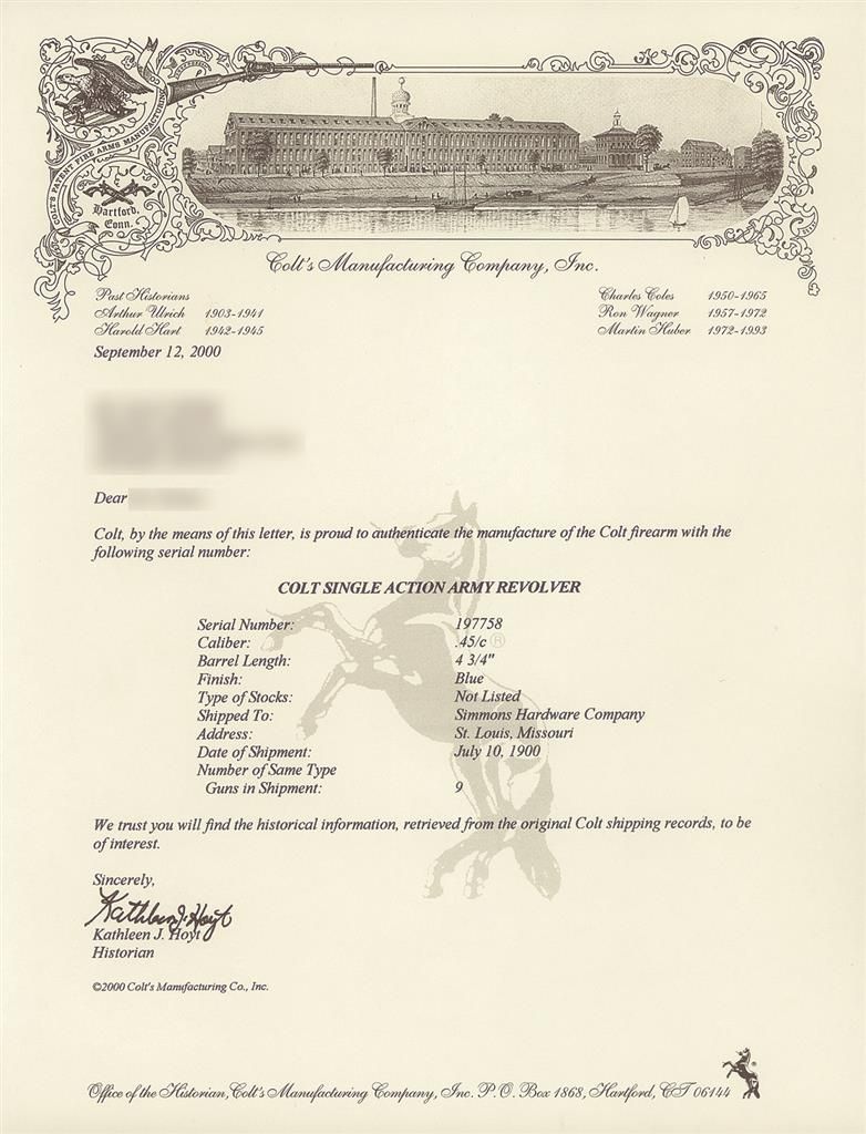 Manufactured in 1900. Factory letter states it has a 45 caliber 4 3/4 inch barrel, is blue, type of stocks are not listed and that it was shipped to Simmons Hardware Company in St. Louis, Missouri on July 10th, 1900.
