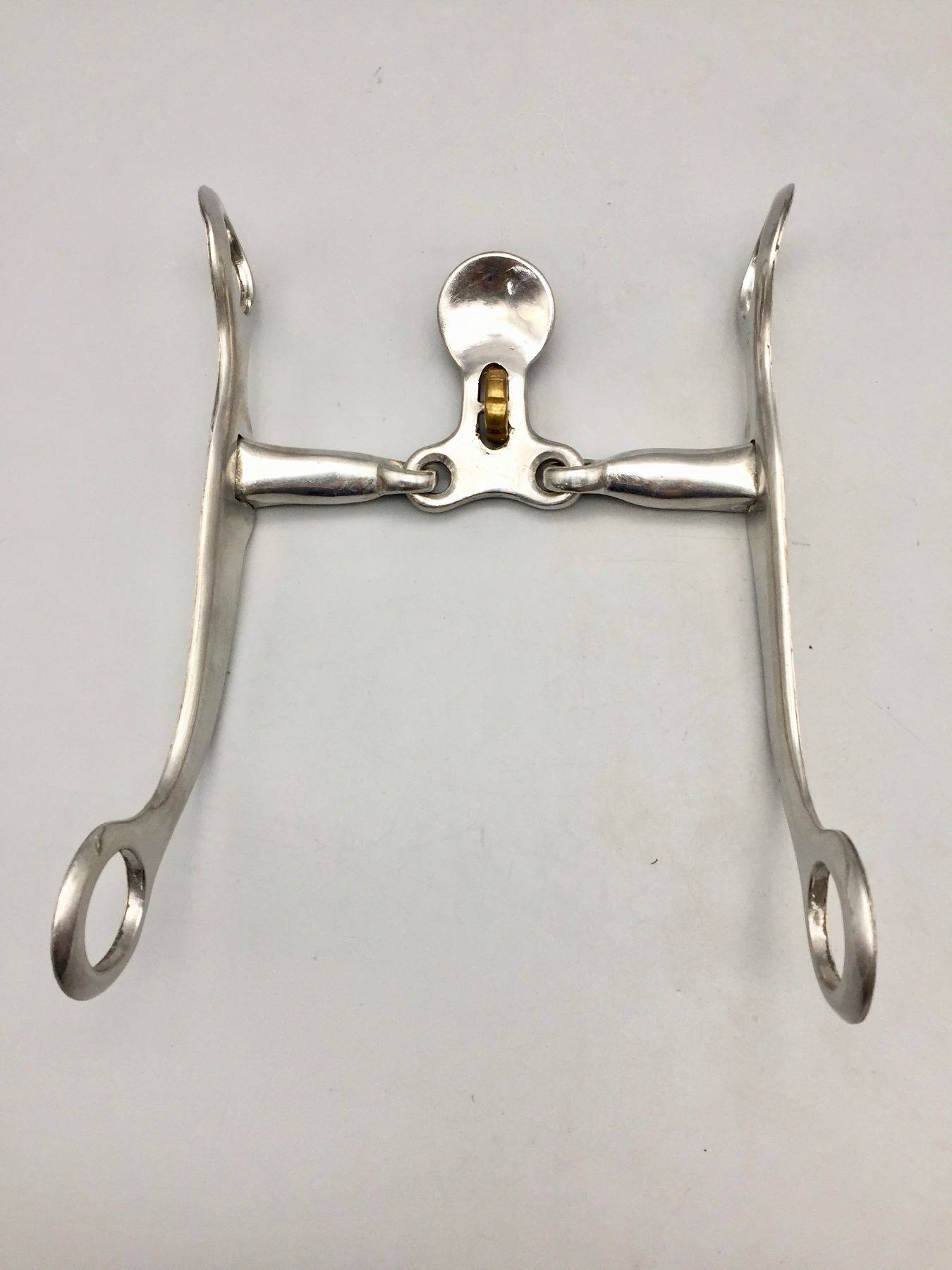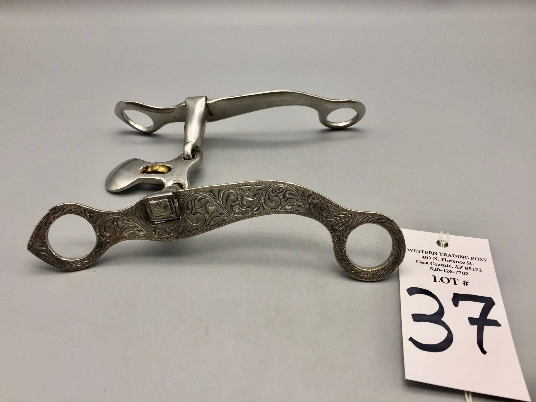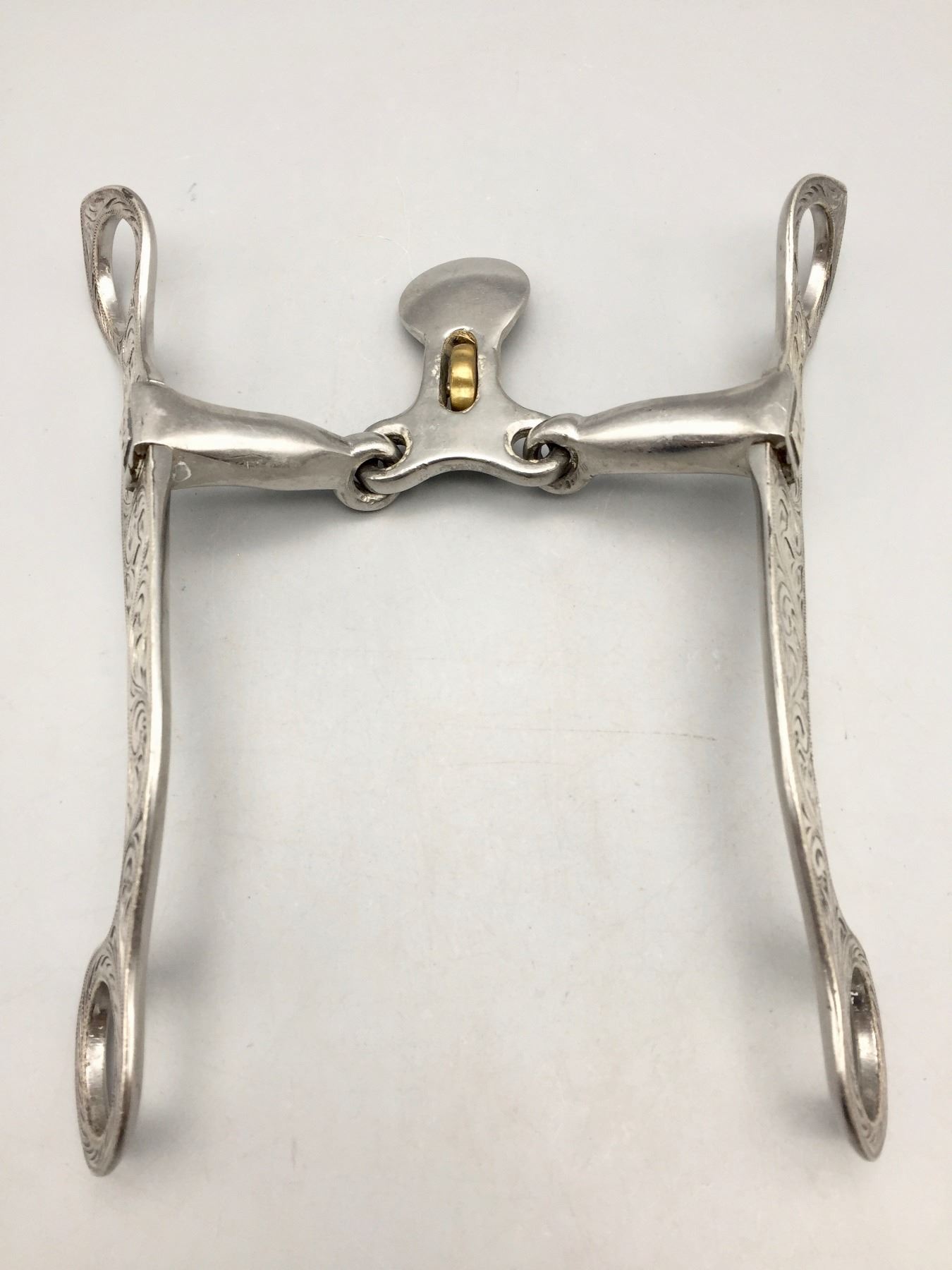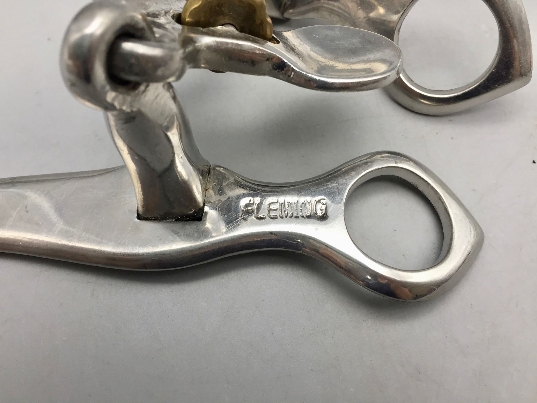 Description: For your bidding pleasure, an outstanding, hand engraved, sterling silver overlay, fancy horse bit by Fleming. Maker: Marked, Fleming. Approx. Age: Fairly modern. Size: Mouth 5” wide, shank 8” long. Condition: Good for its age, normal wear expected. Please look closely at the pictures - they are an important part of our description. Shipping: There will be a $5 handling / packaging fee for shipping this lot. The actual cost of postage will be added on top of that.