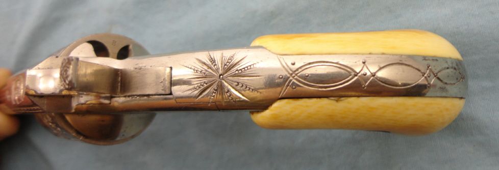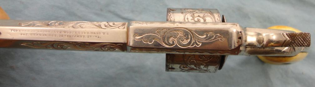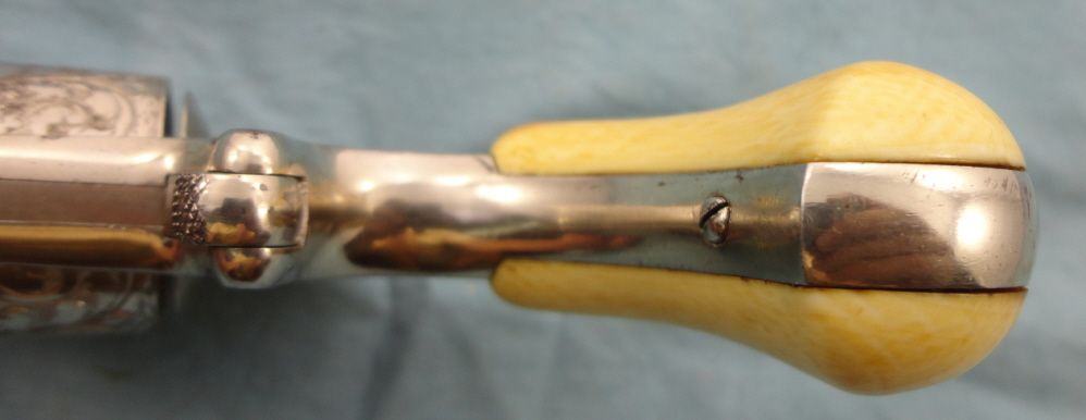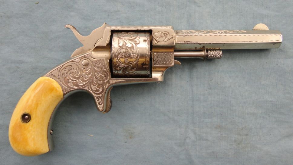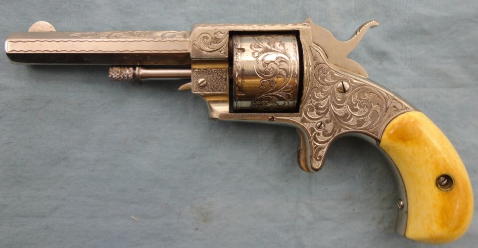 Antique. #B17; 32 cal. 3 1/2" bbl. Nickel plated w/period floral engraving. Grips appear to be ivory & mechanically gun appears to be fine. Very good overall condition w/only small spots of flaking to the nickel finish. Approx. 75% coverage w/engraving & grips are in good condition. Fine example of a higher grade Forehand & Wadsworth.