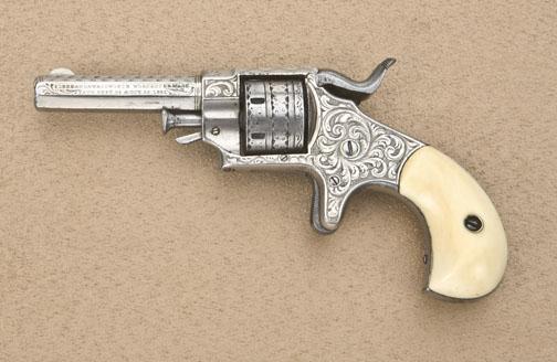 Engraved Forehand & Wadsworth spur trigger revolver, .22 cal., 2-1/2” octagon barrel, nickel finish, beautiful ivory grips, #22060. This gun is in overall very good condition showing approx. 50% original finish withbalance gone to a silvery patina; very nicely executed New York style period engraving; excellent period ivory grips; a real little Gem. Est.: $1,050-$1,550.