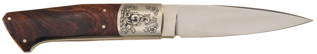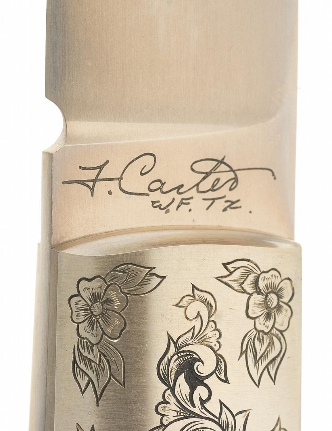 Producing custom knives for over 25 years, Fred Carter has established himself as one of the industry's most renowned knifemakers. He has held two terms as President of the Knifemaker's Guild, is a two-time recipient of the prestigious W.W. Cronk award and winner of the Beretta award for "Excellence in Craftsmanship." Fred Carter is the solo author of his work, including engraving and gold inlay. This Carter knife features a 4 3/8 inch blade signed by the artisan ("F. Carter / W.F. Tx."). The bolster has a floral scroll engraving. Flared handle head with nicely figured hardwood scales (4 rivets). OAL: 9".