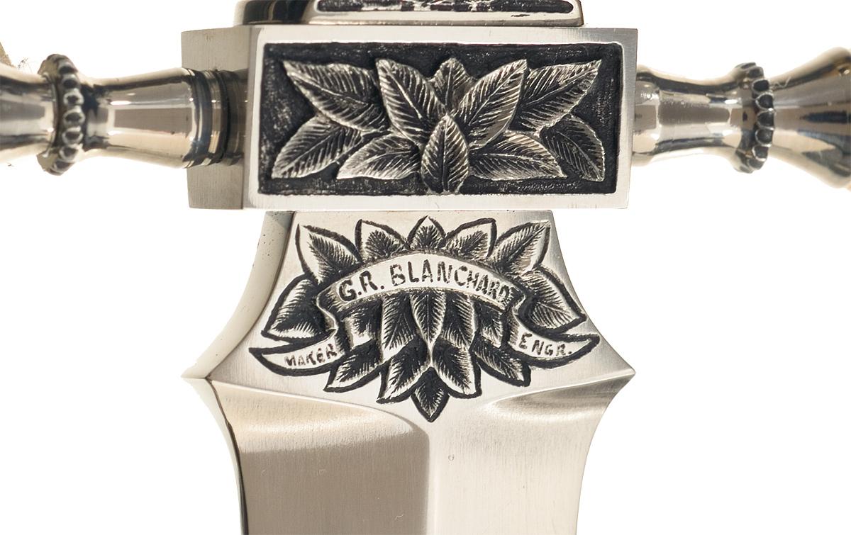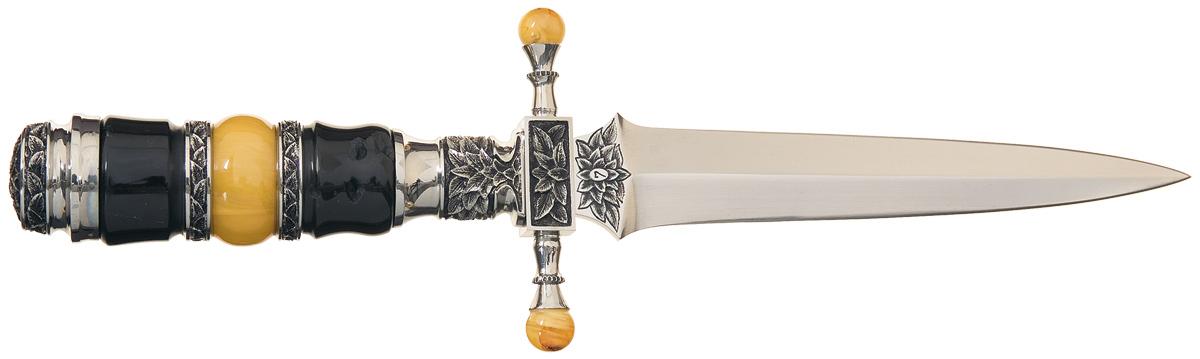 Handcrafted and engraved by Gary R. Blanchard, this dagger features a 4 5/8 inch blade. Both sides of the ricasso feature a leaf engraving with "G.R. BLANCHARD / MAKER ENGR." marked on one side and the number "7" marked on the other side. The leaf engraving extends to the hilt. "T" guard adorned with two yellow transparent composite spheres on the ends. Horn handle with a yellow transparent composite middle section flanked by leaf engraved bands. Blanchard started in the knife making business as a scrimshander in the 1977 and by the early 1980s was engraving knives in his on unique style and handcrafting his own knives. Today, Blanchard continues to design and fabricate custom knives. OAL: 8 1/2"